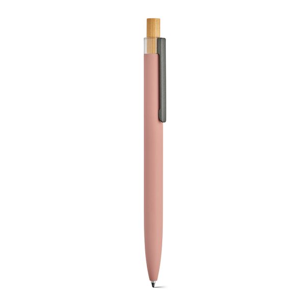 Uma esferográfica ecológica, cuidadosamente projetada com um corpo de alumínio reciclado e complementada com elementos de rPET e bambu na parte superior.