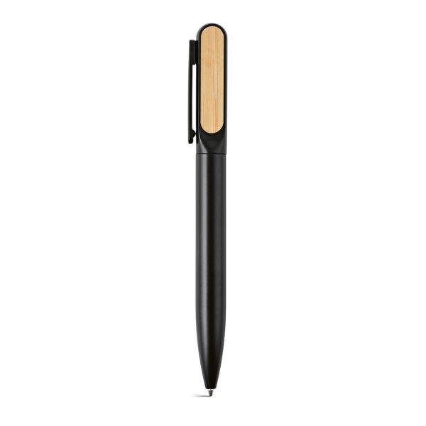 Uma sinfonia de sustentabilidade e estilo, a nossa esferográfica possui corpo em alumínio reciclado e topo em rABS e bambu.