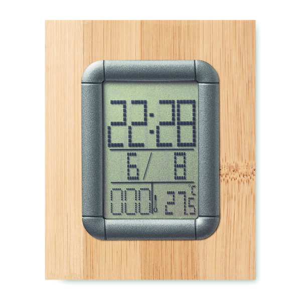 Porta-canetas de bambu com calendário, despertador e termómetro.