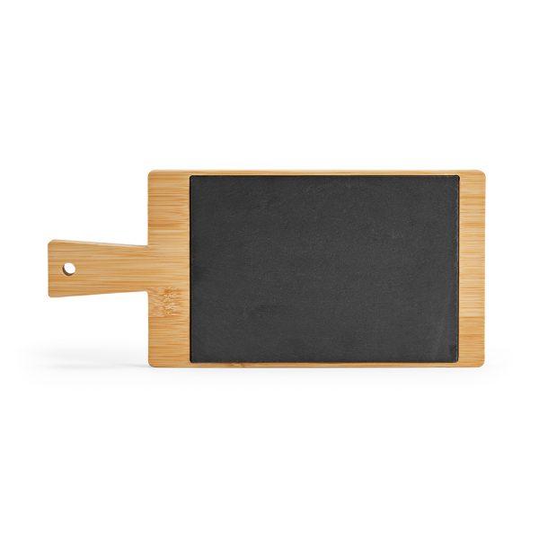Esta tábua de bambu de 15 x 33 x 3 cm com ardósia apresenta uma pega e pode ser o destaque das reuniões.