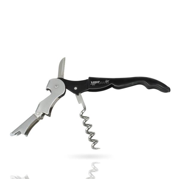 Saca-rolhas em bambu e aço inox, c/ abre-cápsulas e canivete