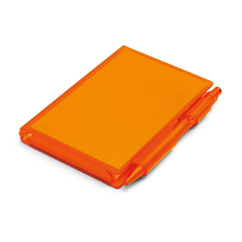 Porta-notas. PP rígido. Com 80 folhas lisas. Inclui esferográfica