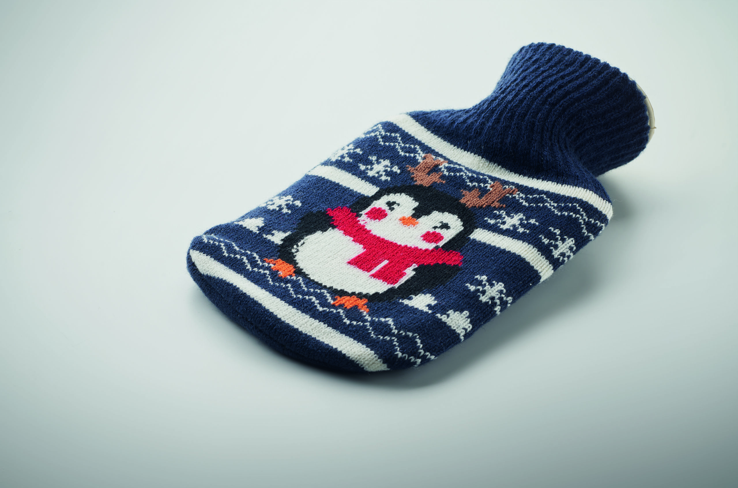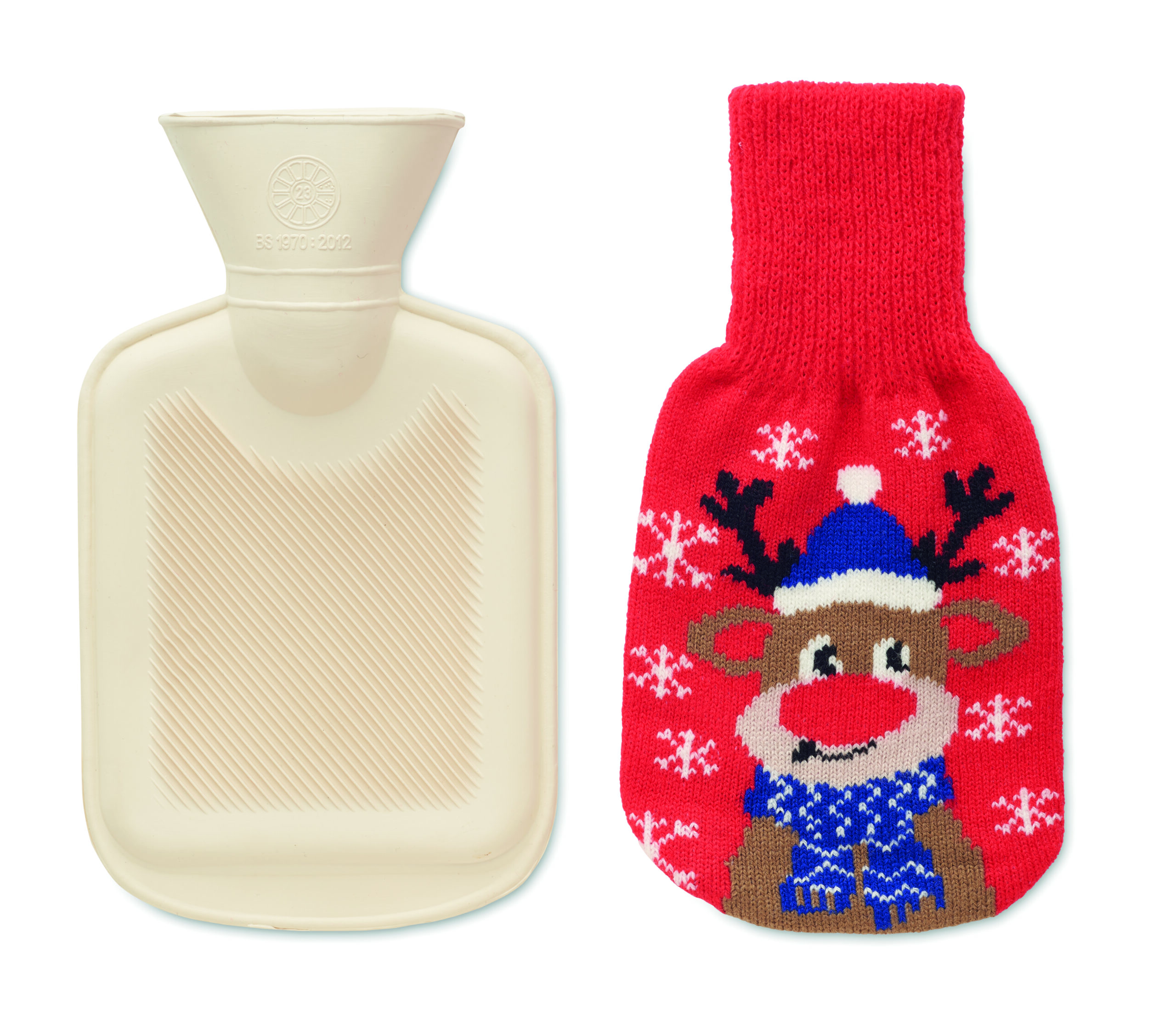 Garrafa de água quente com jersey em padrão natalino. Usado para fornecer calor, normalmente na cama, mas também para aplicar calor a uma parte específica do corpo. Capacidade de 250 ml.