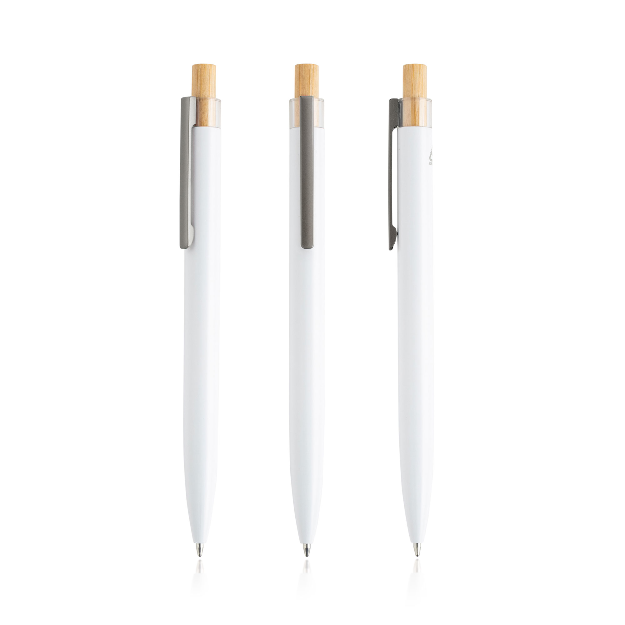 Esferográfica em alumínio reciclado, detalhe em bambu. Feita em alumínio reciclado de desperdício e em fim de vida útil, utilizando processos de derretimento e aproveitamento. Ao comprar esta esferográfica, está a ajudar a reduzir as libertações de carbono e a reduzir o lixo que deriva da não reutilização. Esta esforográfica de escrita azul tem ainda um clique de bambu, seguindo as tendências do mercado.