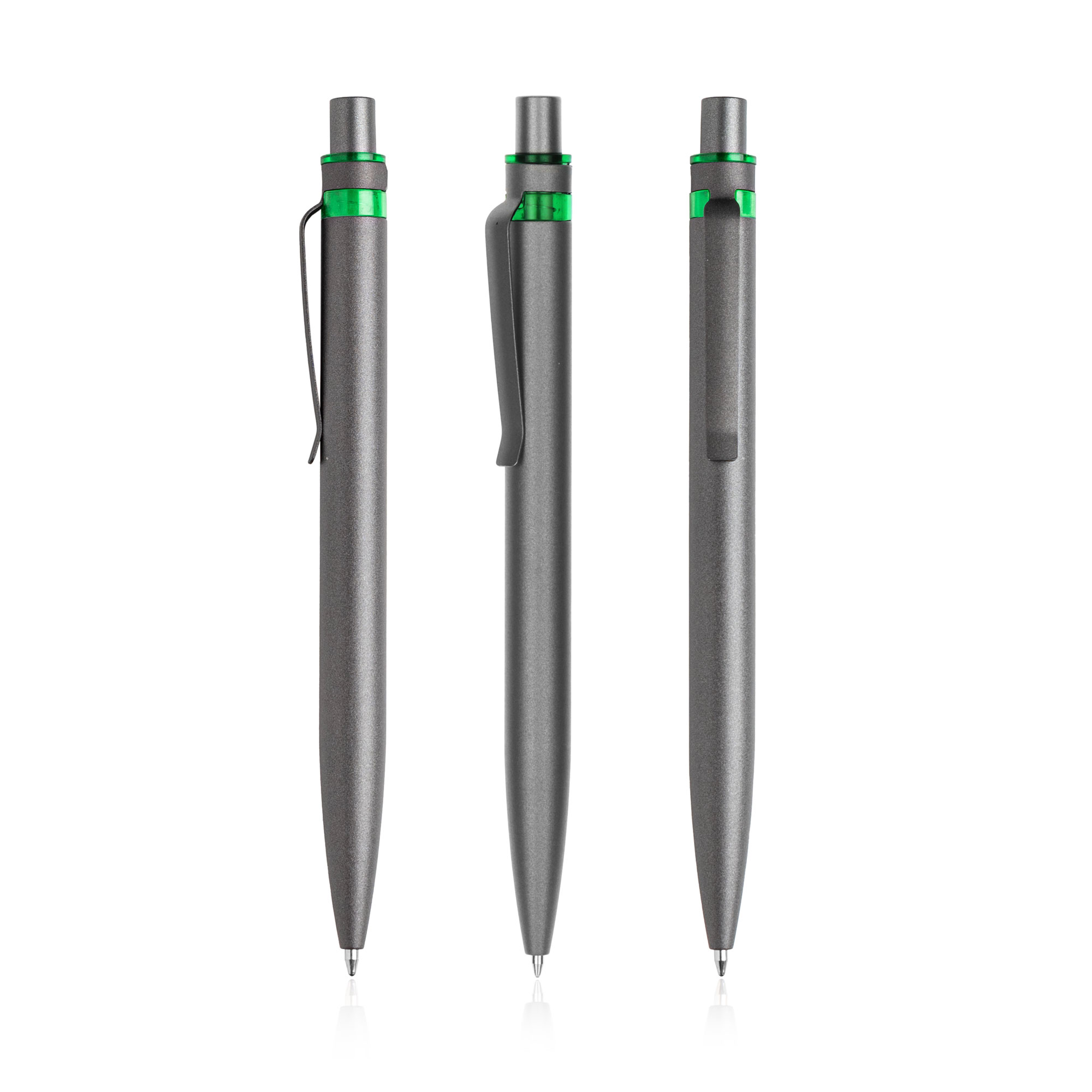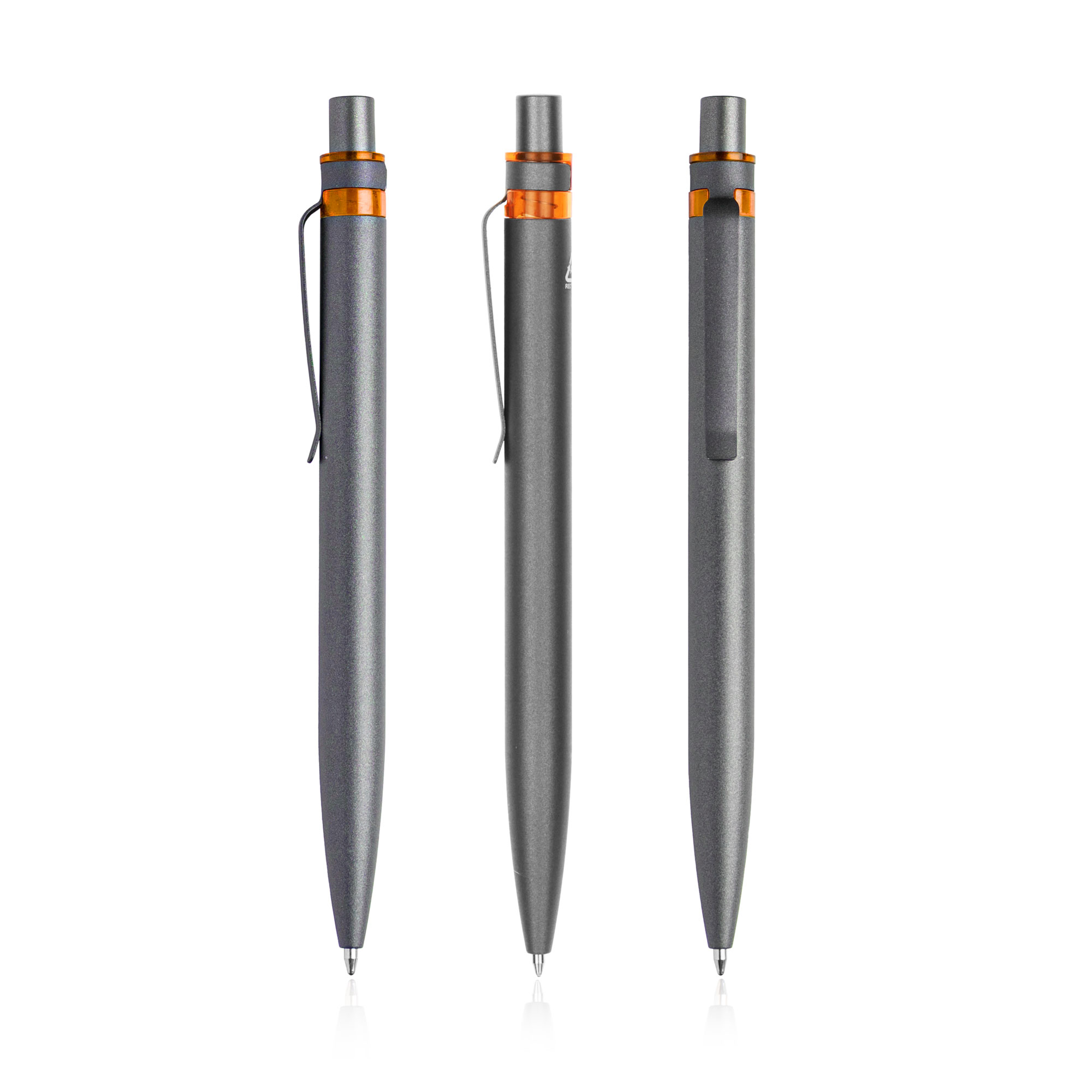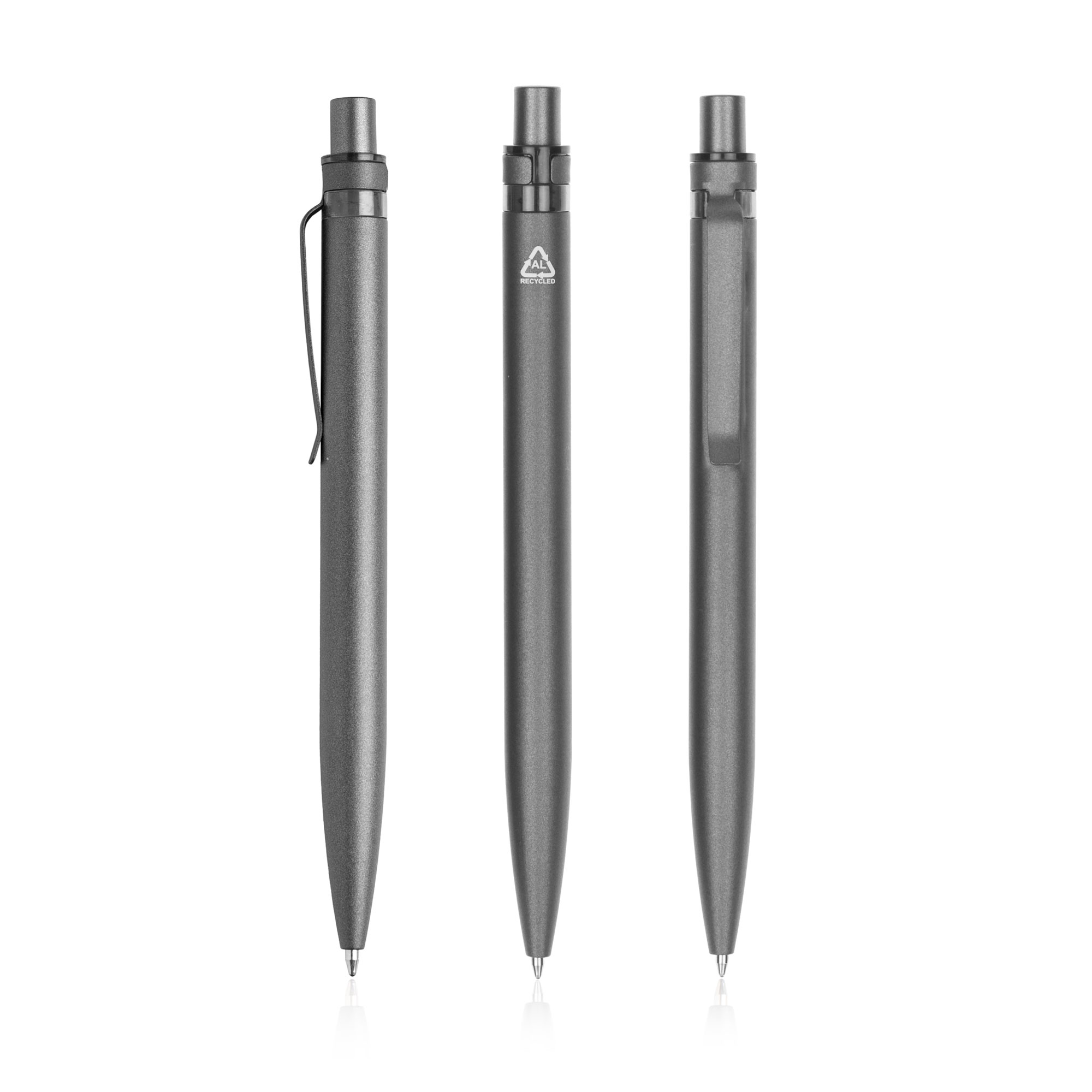 Esferográfica em alumínio reciclado, detalhe colorido. Feita em alumínio reciclado de desperdício e em fim de vida útil, utilizando processos de derretimento e aproveitamento. Ao comprar esta esferográfica, está a ajudar a reduzir as libertações de carbono e a reduzir o lixo derivado da não reutilização.