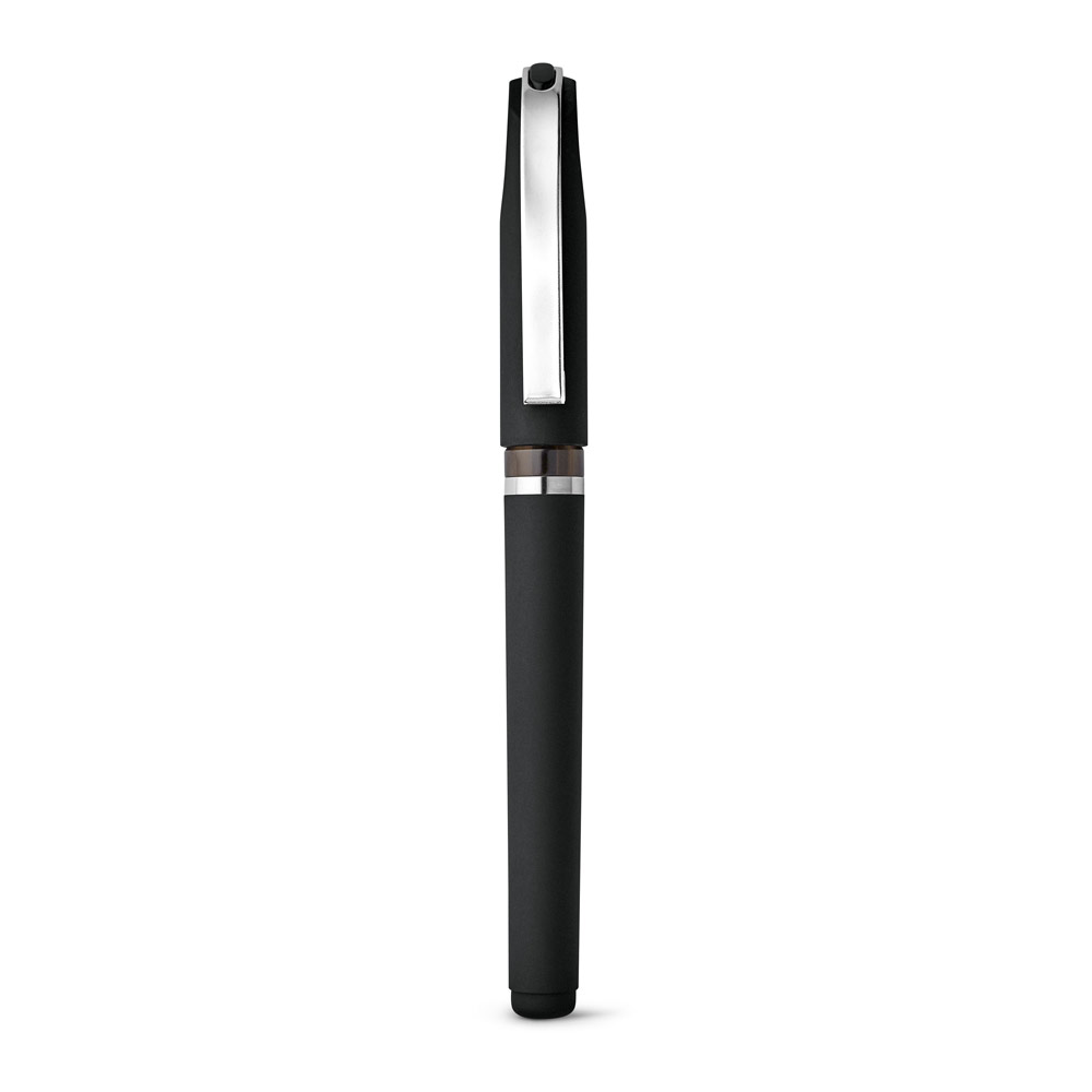 Esferográfica em ABS com acabamento em borracha e clipe em metal. Esferográfica com antideslizante e escrita a preto com recarga de gel incluída.