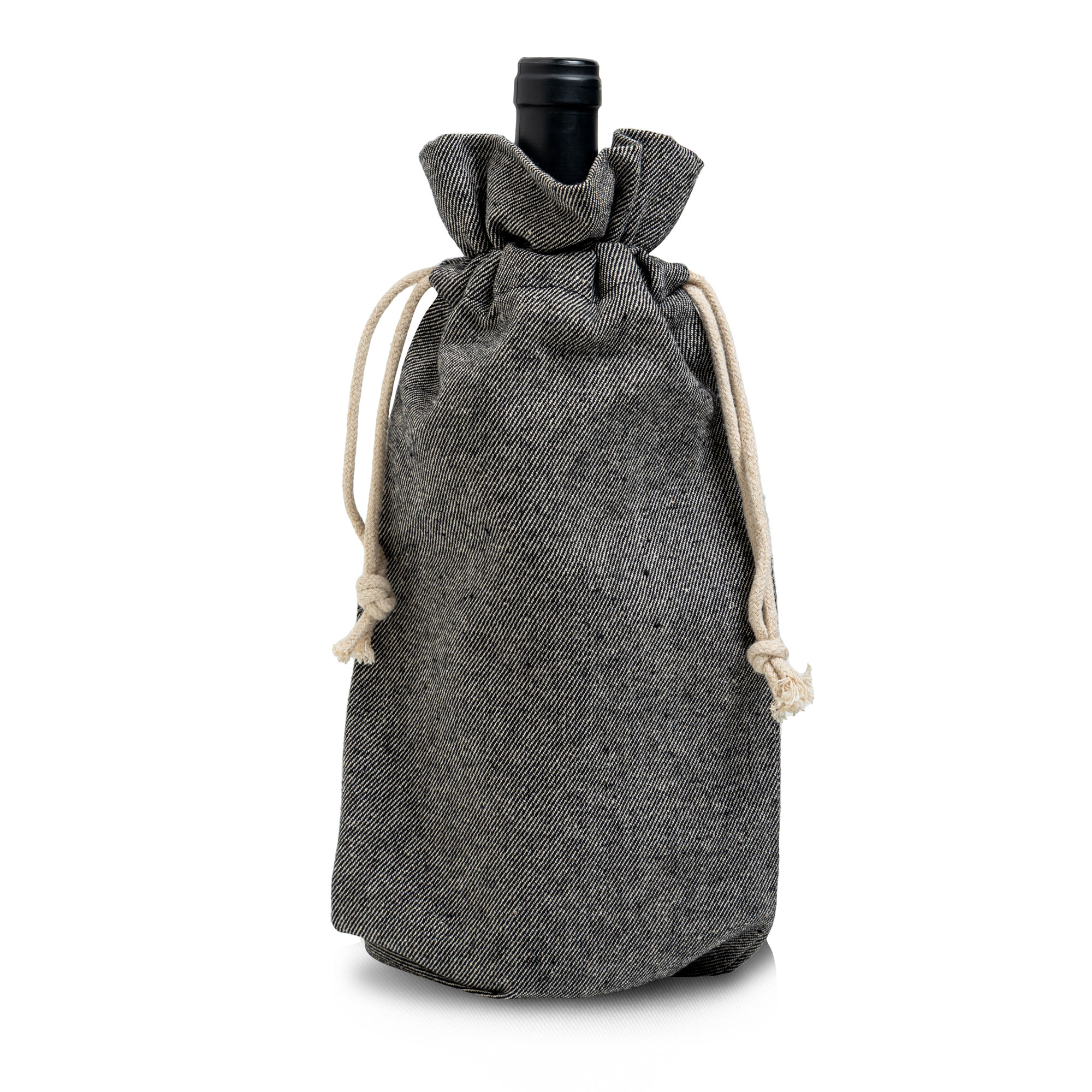 Saco de prenda para garrafa. Saco algodão reciclado de alta gramagem e atilhos. Cansado de embrulhos de papel? Torne uma garrafa num presente especial, com um embrulho ecológico que, não só levará a sua marca, como poderá ser reutilizado.