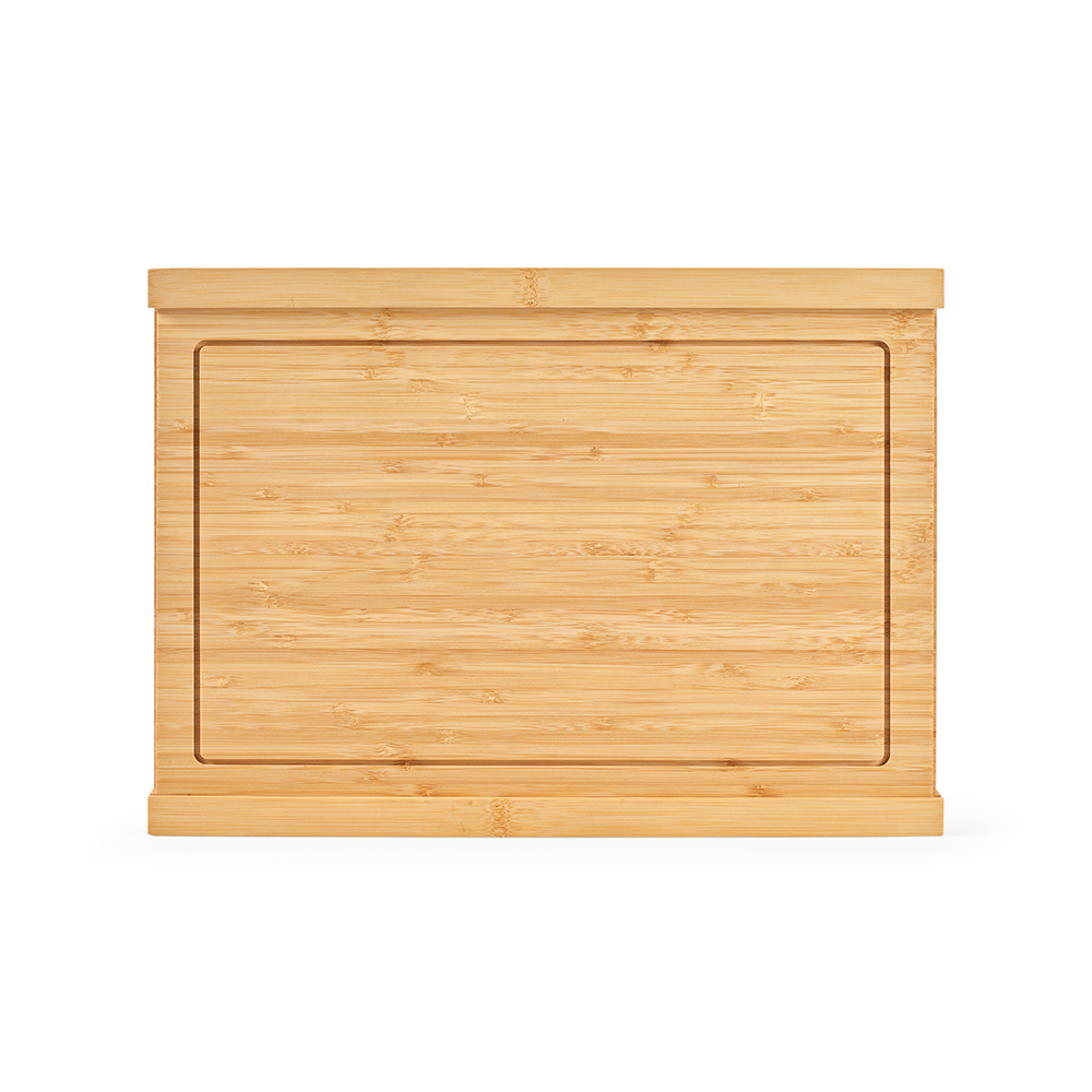 Esta é uma notável tábua de bambu. Com dimensões de 28 x 39 x 4,5 cm e uma ranhura que circunda o seu perímetro, ela guarda um segredo – uma bandeja deslizante com três facas de cozinha. Vem numa caixa de cartão reciclado individual.