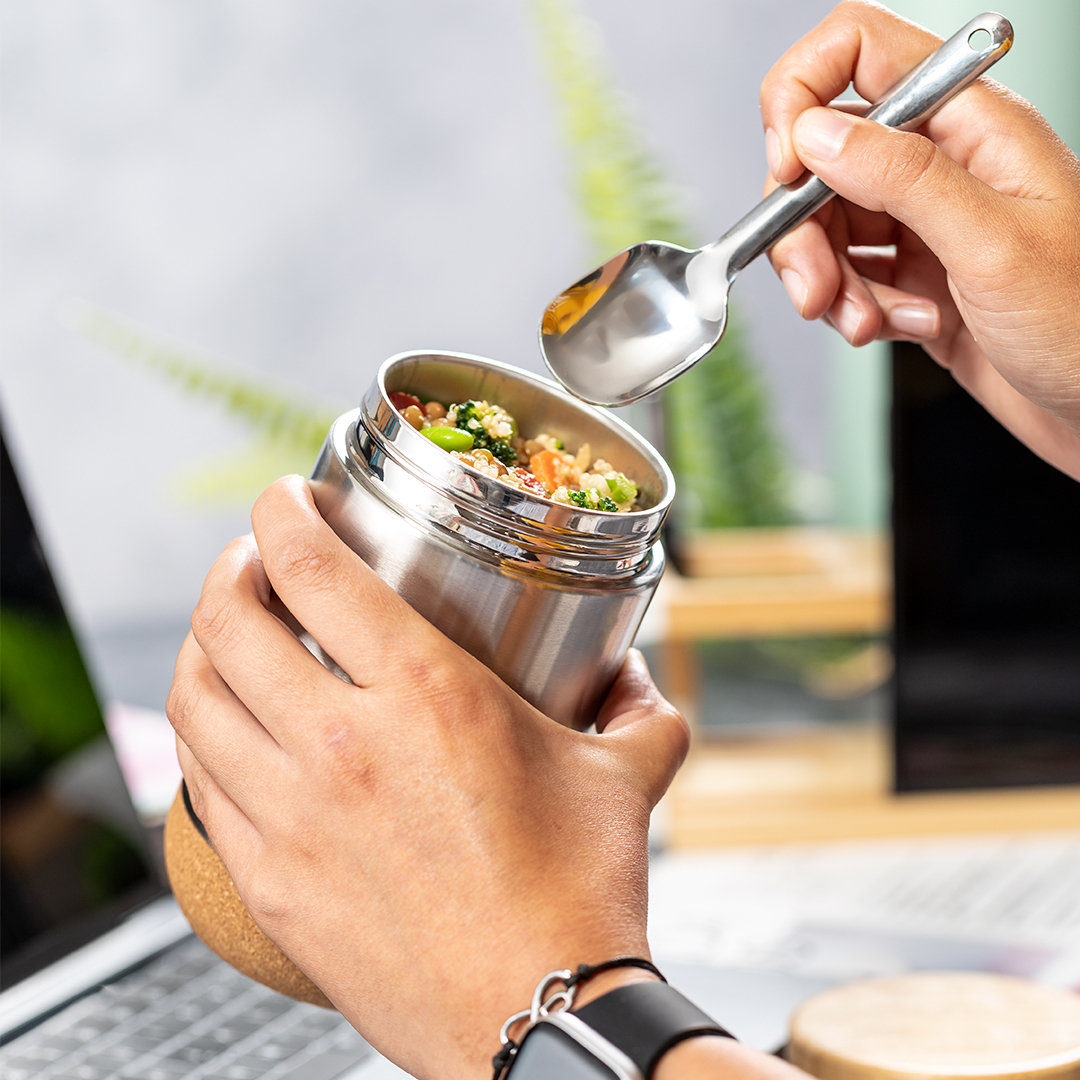 Lancheira da linha nature com 450 ml de capacidade. Corpo em aço inoxidável com parede dupla, com base em cortiça para manter a temperatura e tampa de segurança em bambu, com acessório de fixação para colher de aço inoxidável (incluída). Apresentado numa caixa individual de design eco em cartão kraft.
