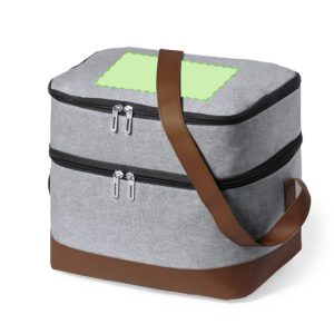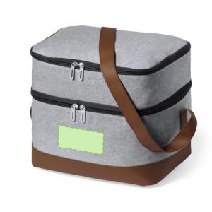 Bolsa refrigeradora fabricada em resistente 600D RPET. Acabamento em cor cinza, com base e fita tiracolo de transporte em polipele castanho. Inclui 2 compartimentos independentes, com fecho de correr e puxadores metálicos. Interior isotérmico em alumínio e etiqueta exterior com distintivo RPET. O material RPET elabora-se a partir de plástico reciclado, para assim fomentar a reutilização de resíduos plásticos e ajudar a sustentabilidade do planeta.