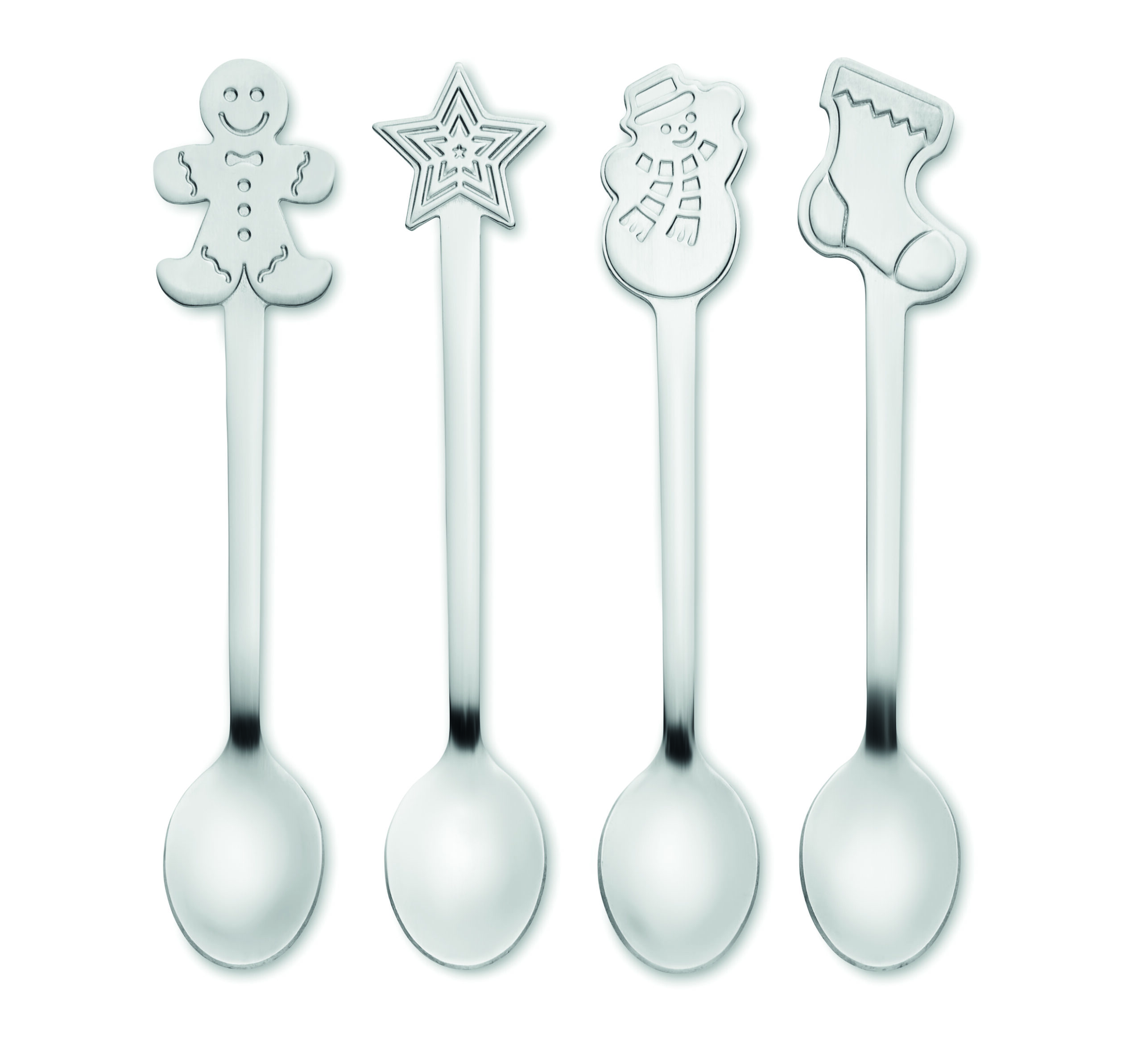 Conjunto de 4 colheres de chá diferentes em aço inoxidável com motivos de Natal. Apresentadas numa caixa de brindes
