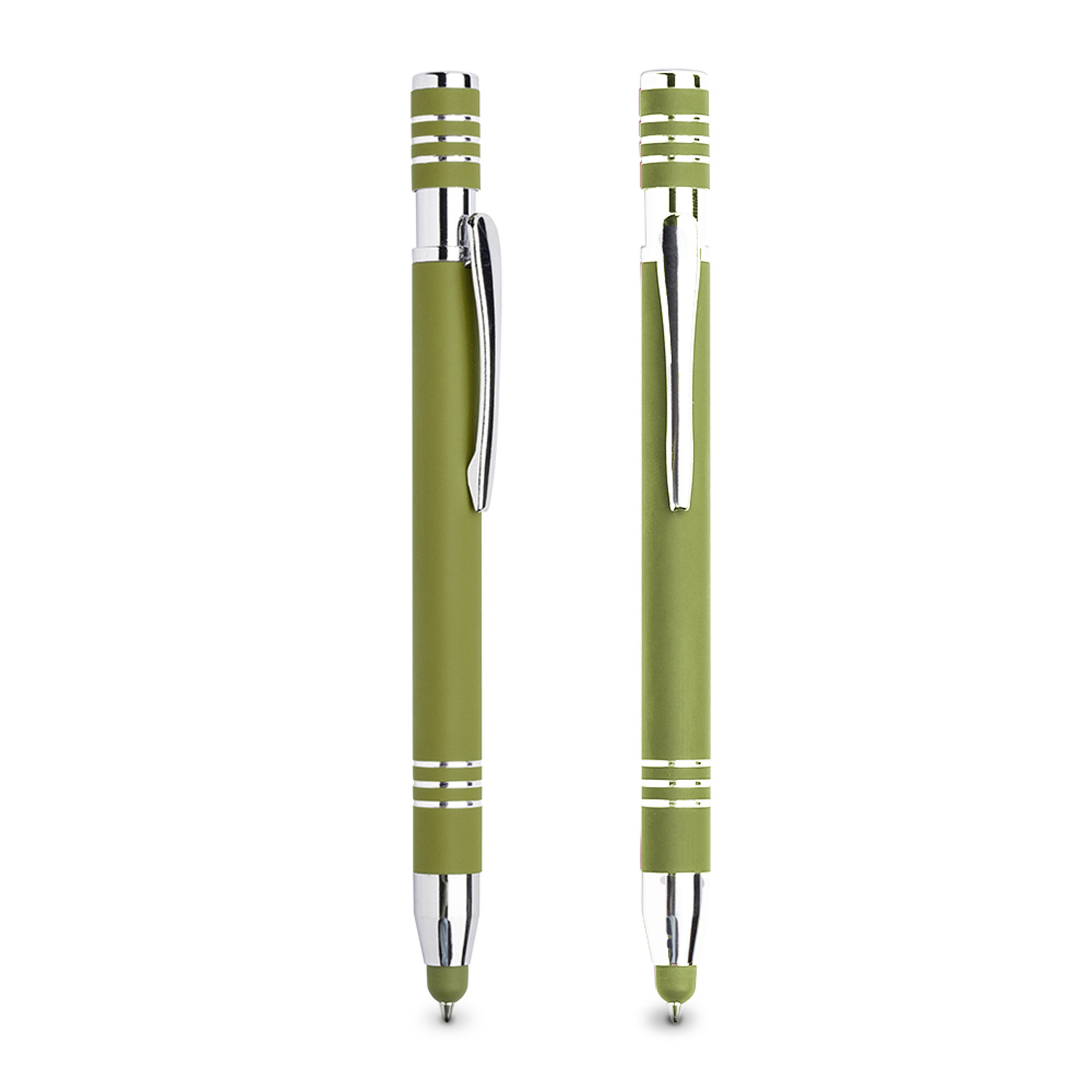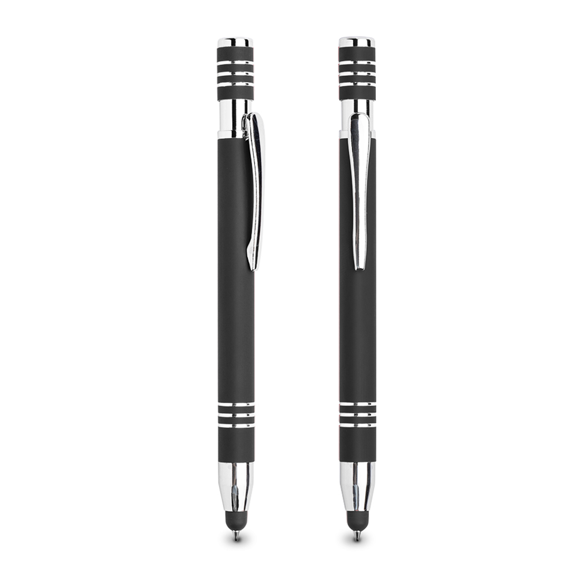 Esferográfica em alumínio, com acabamento em borracha e touch. Um modelo clássico, com anéis a combinar no corpo e no topo. Com touch à cor do corpo e clip metálico brilhante com sistema pulsar. Esta esferográfica é de escrita azul.