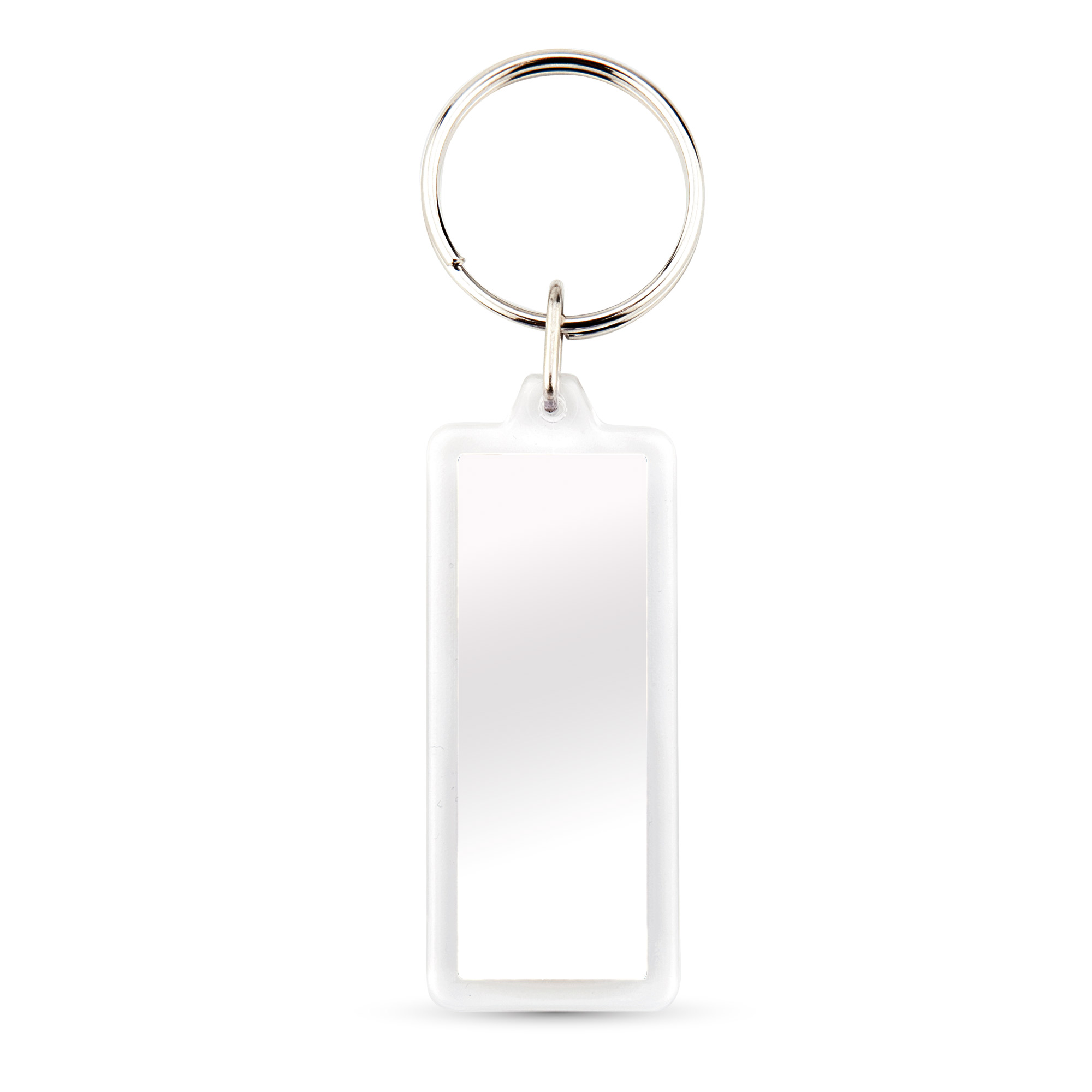 Porta-chaves CR-18 em acrílico, com formato retangular. Personalizado com inserção de papel em 2 faces (18x50mm) e tampa em acrílico.