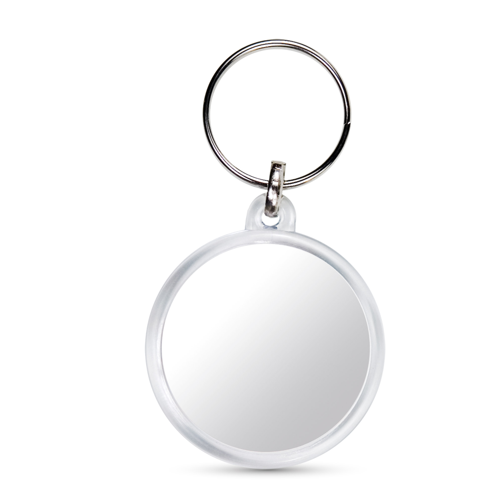 Porta-chaves CR-37 em acrílico, com formato redondo. Personalizado com inserção de papel em 2 faces (Ø37mm) e tampa em acrílico.