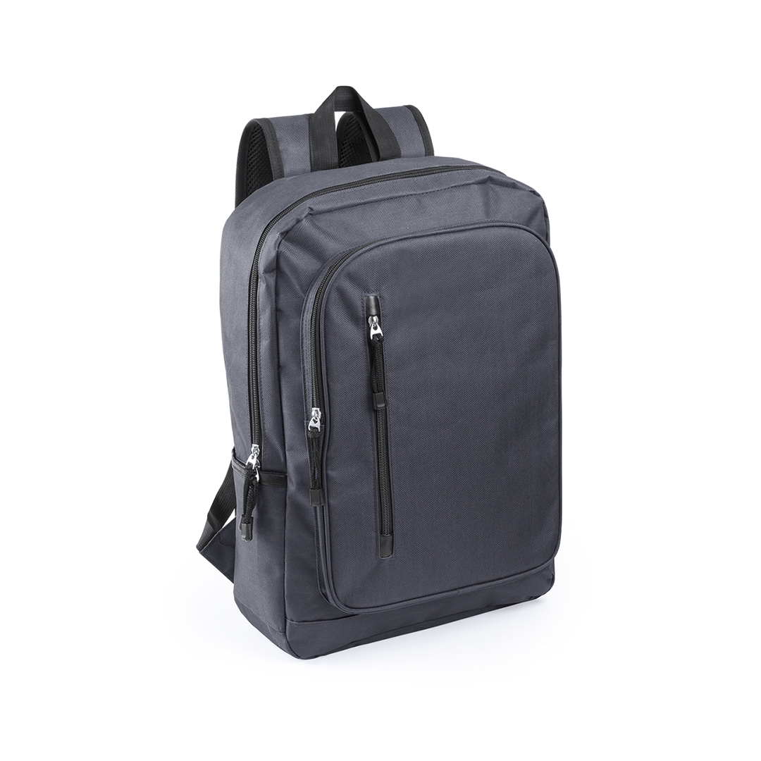 Mochila de poliéster 600D resistente com fecho e bolsos frontais. Em cores sóbrias, com costas e alças acolchoadas, compartimento acolchoado interior para portáteis até 15 polegadas e alças com tiras fácil abertura.