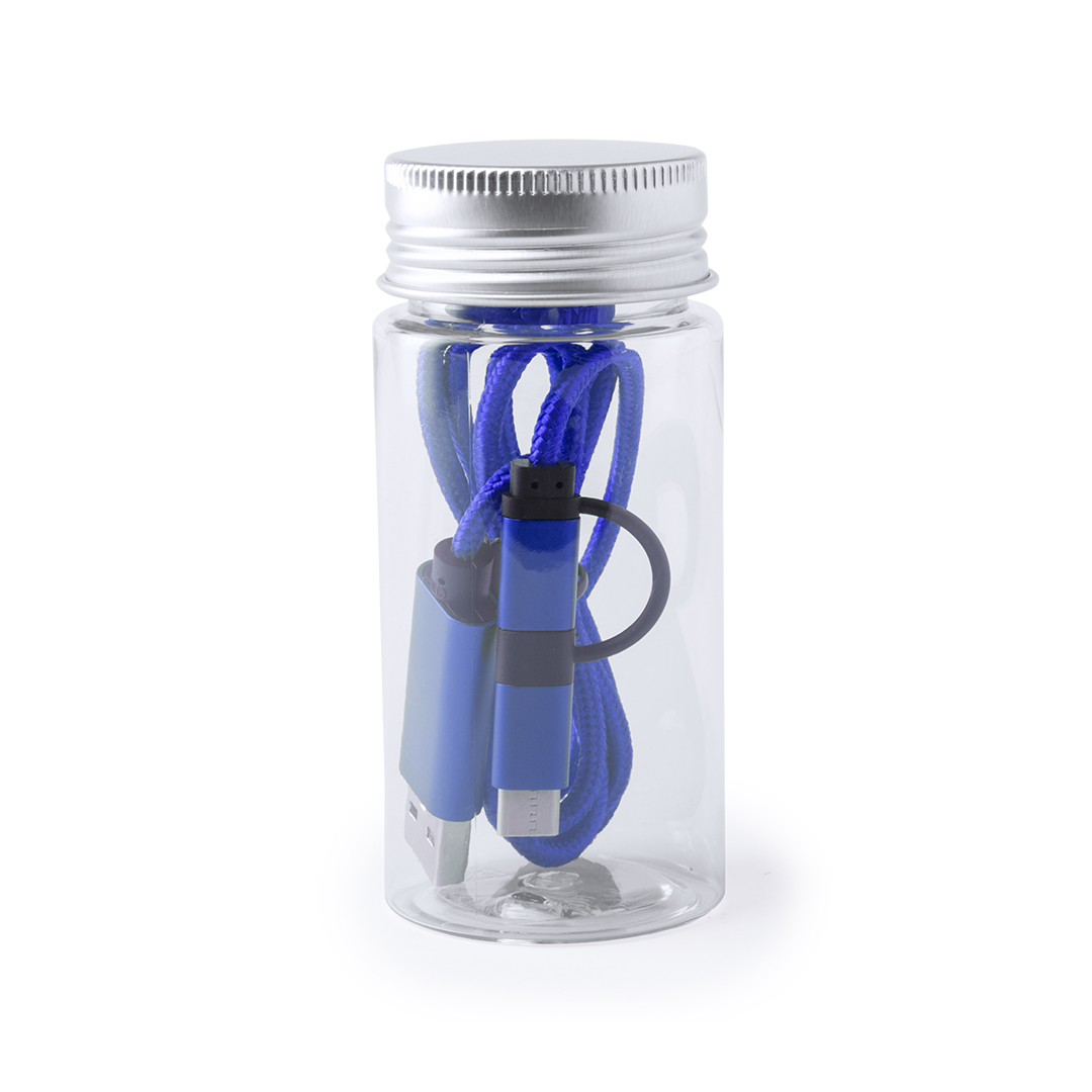 Cabo carregador tipo C e com conexão dual micro USB / Lightning. Com revestimento de nylon extra resistente para uso intensivo. 100cm de comprimento, com conectores em alumínio, especialmente concebidos para marcação a laser. Disponível numa variedade de cores e apresentado em atrativa garrafa transparente com tampa de rosca.
