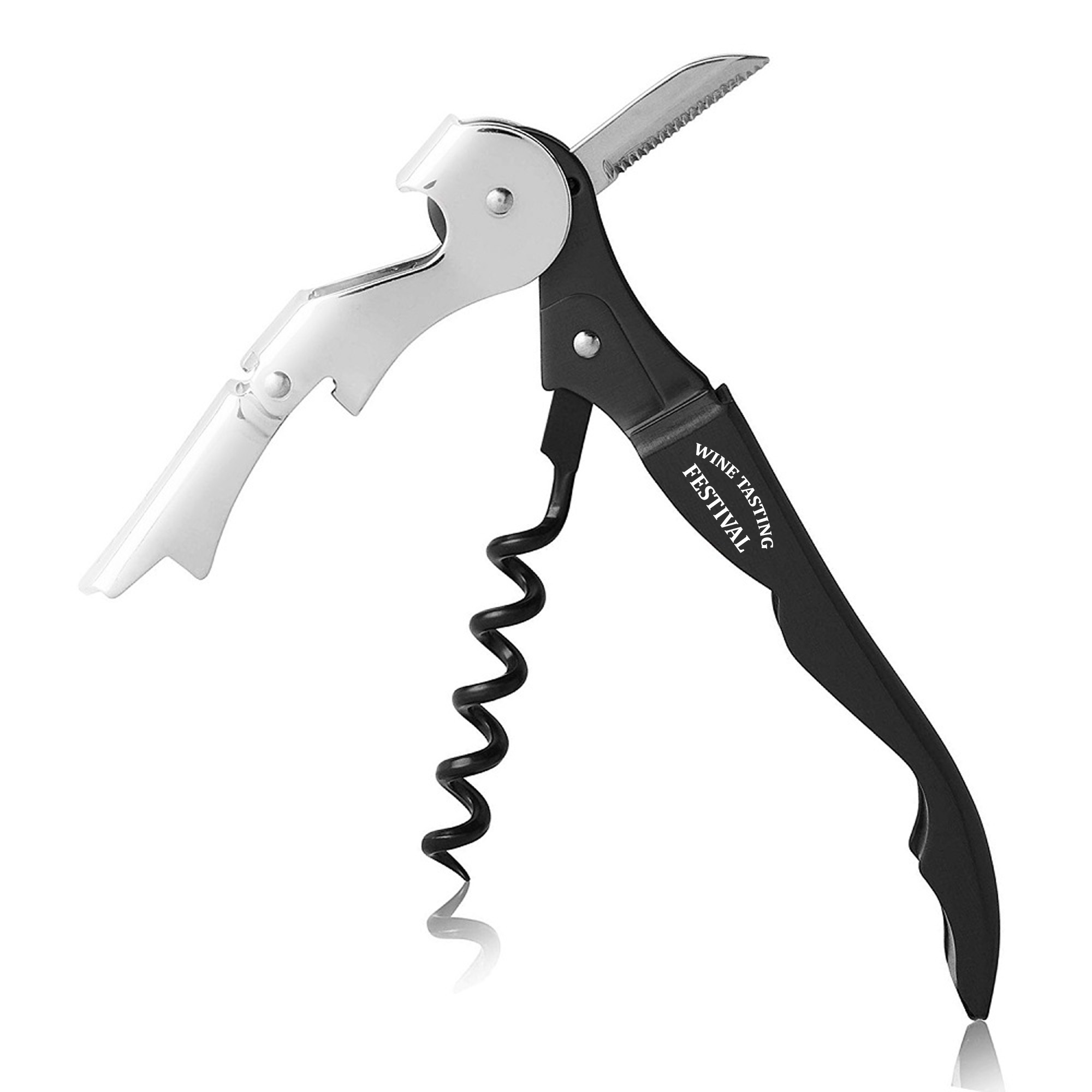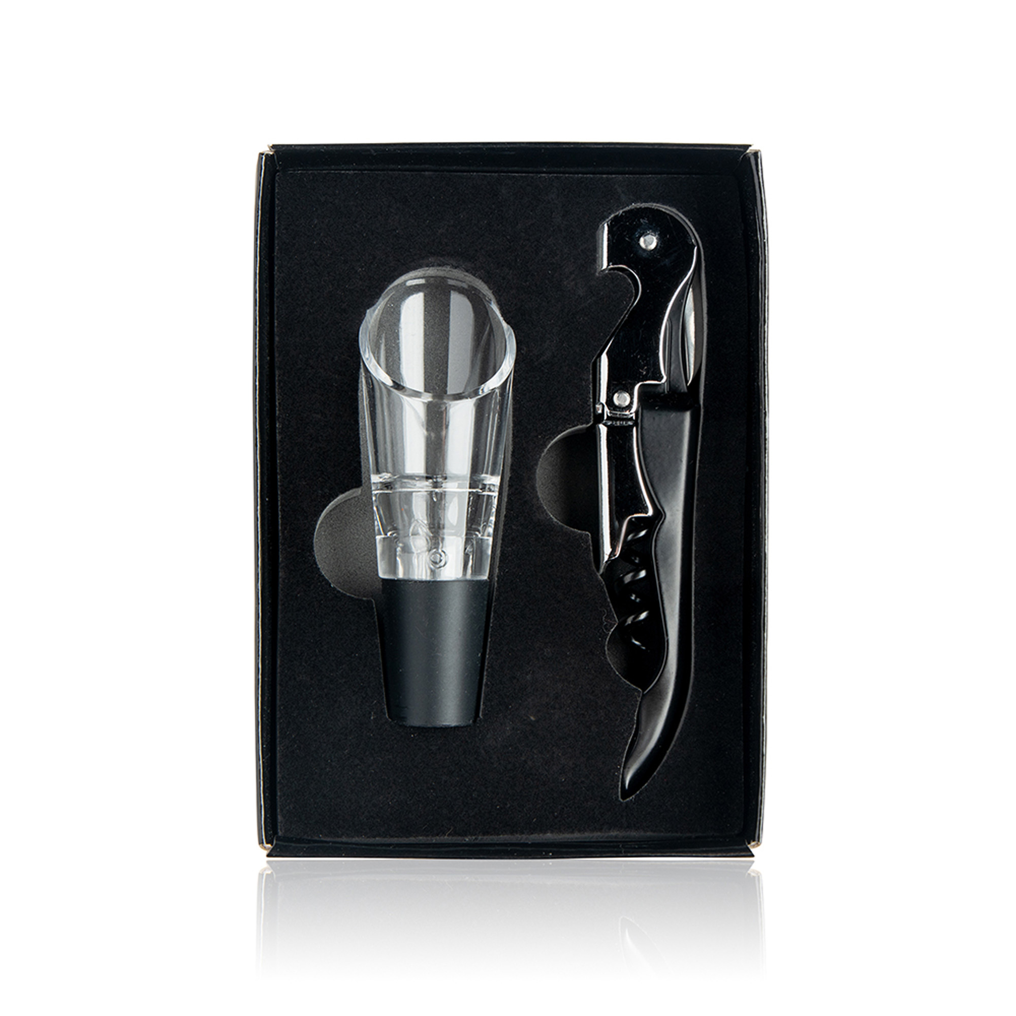 Set de vinho em aço inoxidável, com saca-rolhas e decantador. Um kit de vinho glamoroso, em aço inoxidável, composto por duas peças com quatro funções: abre-cápsulas, saca-rolhas, canivete e decantador. Como brinde completo, este kit vem numa caixa de oferta preta, que pode personalizar com o seu design.