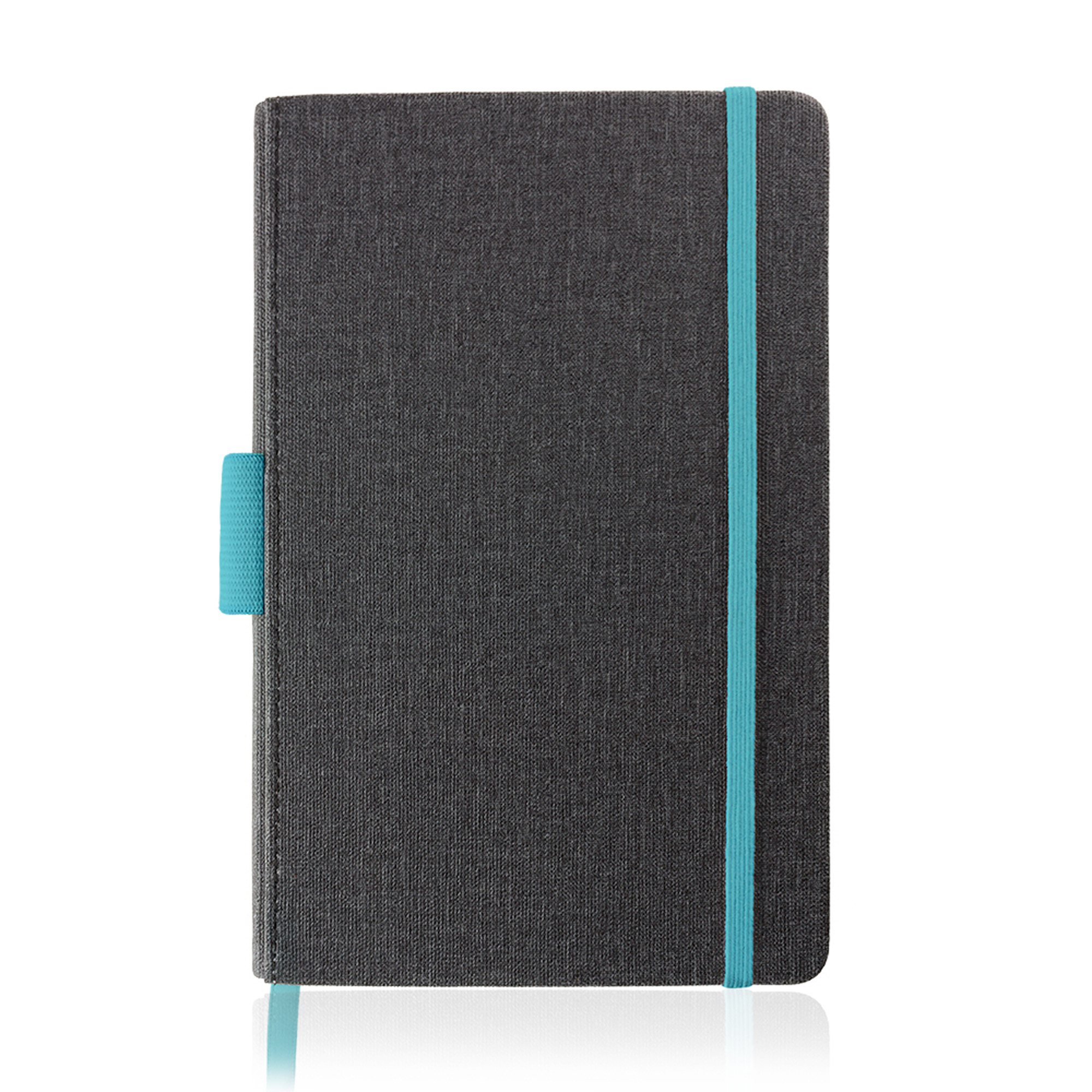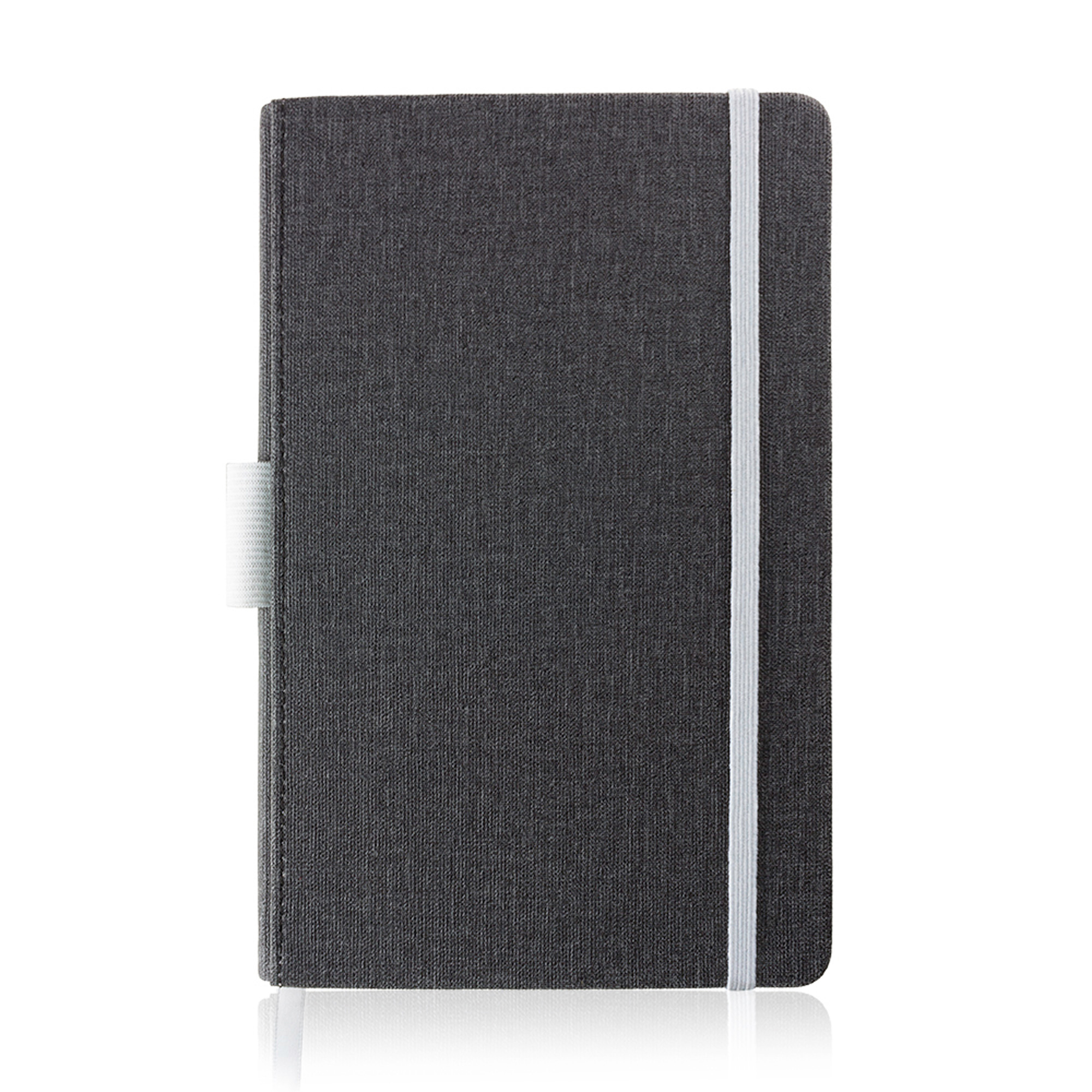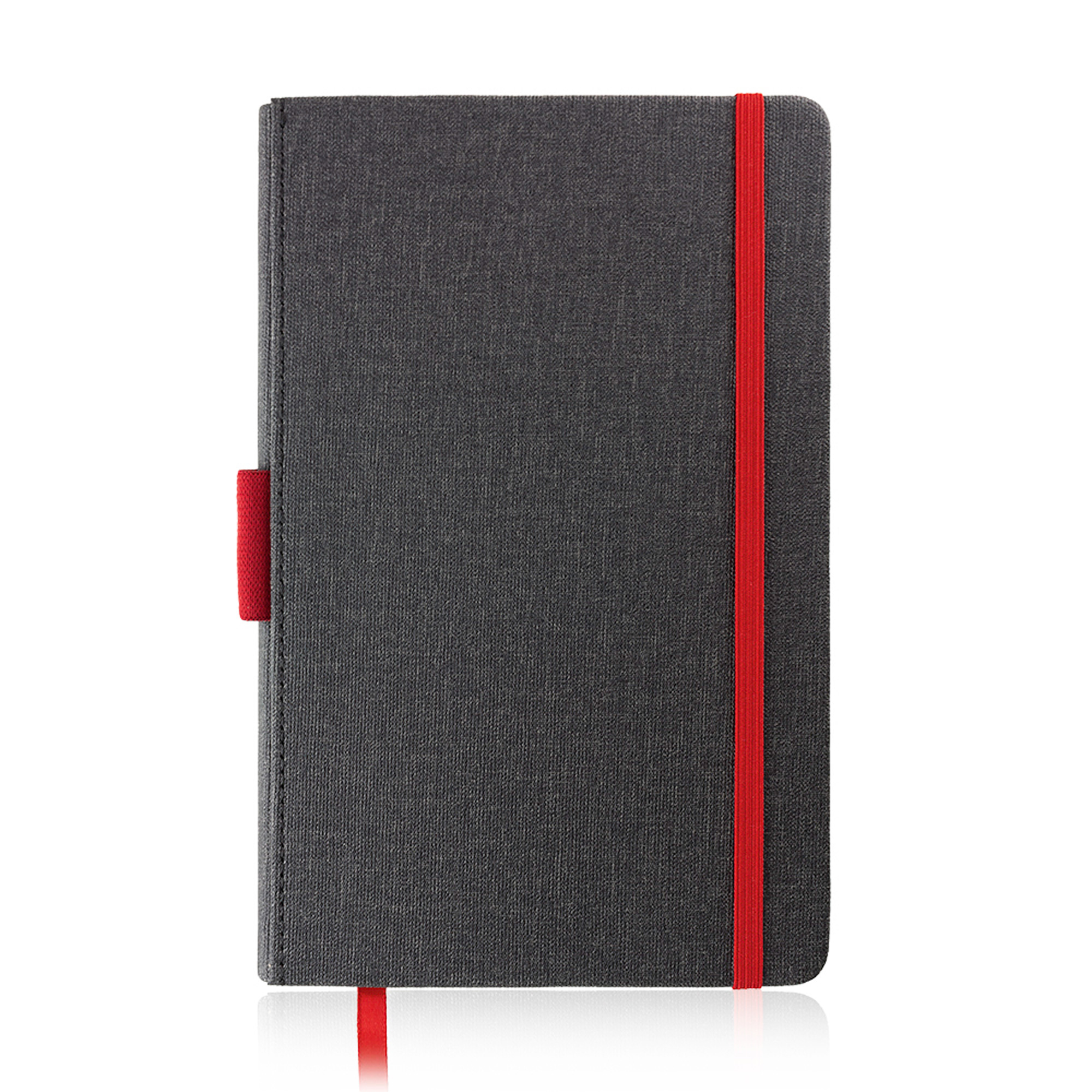 Bloco de notas A5 com capa em PU e porta-esferográfica. Com 96 folhas pautadas de 80g, este bloco tem uma capa em PU térmico, com uma textura visualmente semelhante a tecido. Detalhes coloridos abrilhantam a capa preta. Destaque para o porta-esferográfica, para que nunca perca a sua caneta favorita de vista.