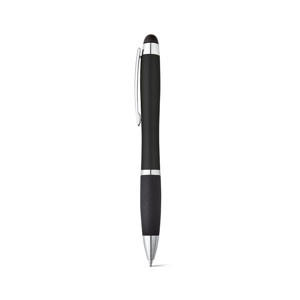 Esferográfica com mecanismo twist e clipe em metal. Esferográfica com antideslizante e ponteira touch. Possibilidade de personalização com logo retroiluminado, efeito LED ao pressionar a ponteira touch. Escrita a azul. Inclui três pilhas AG3