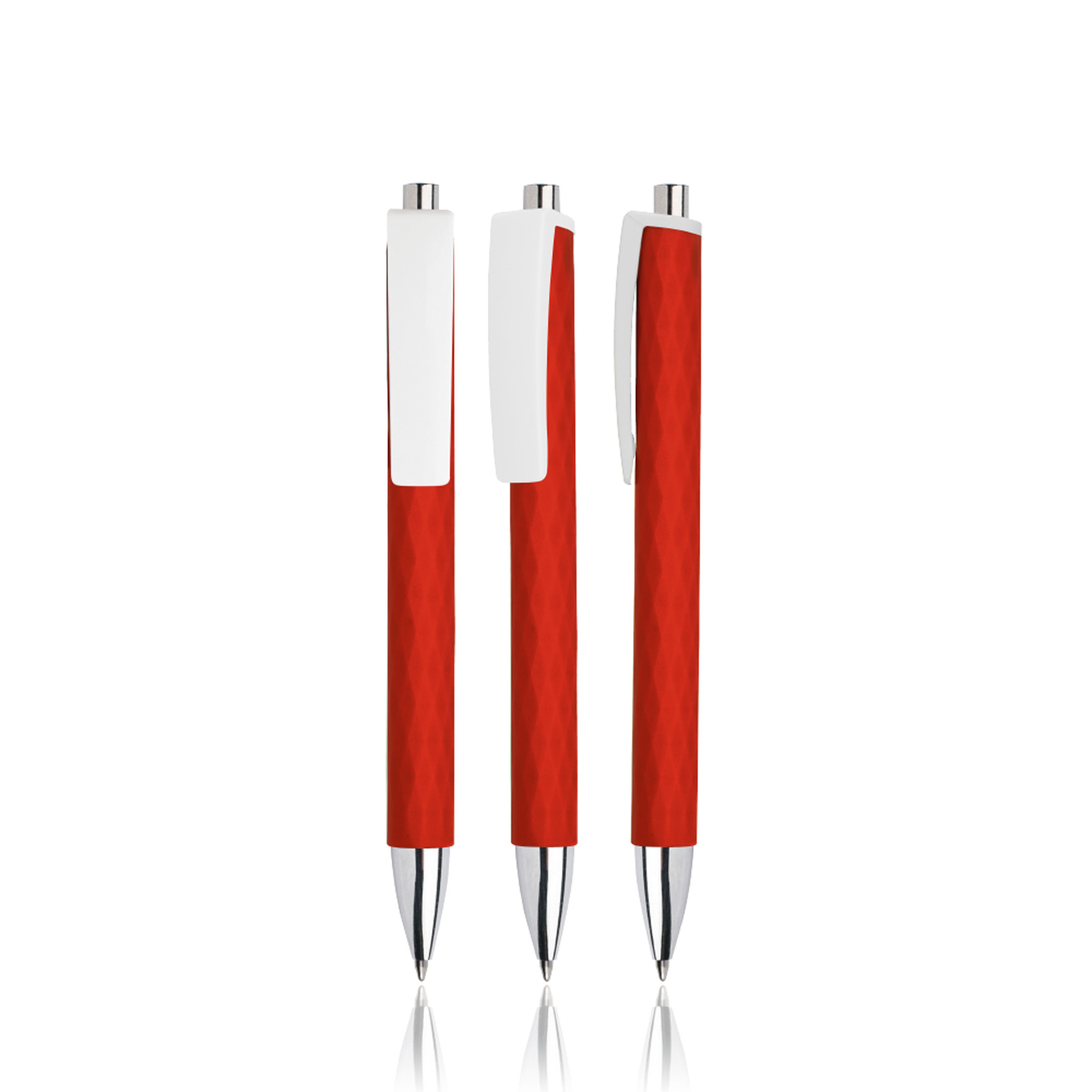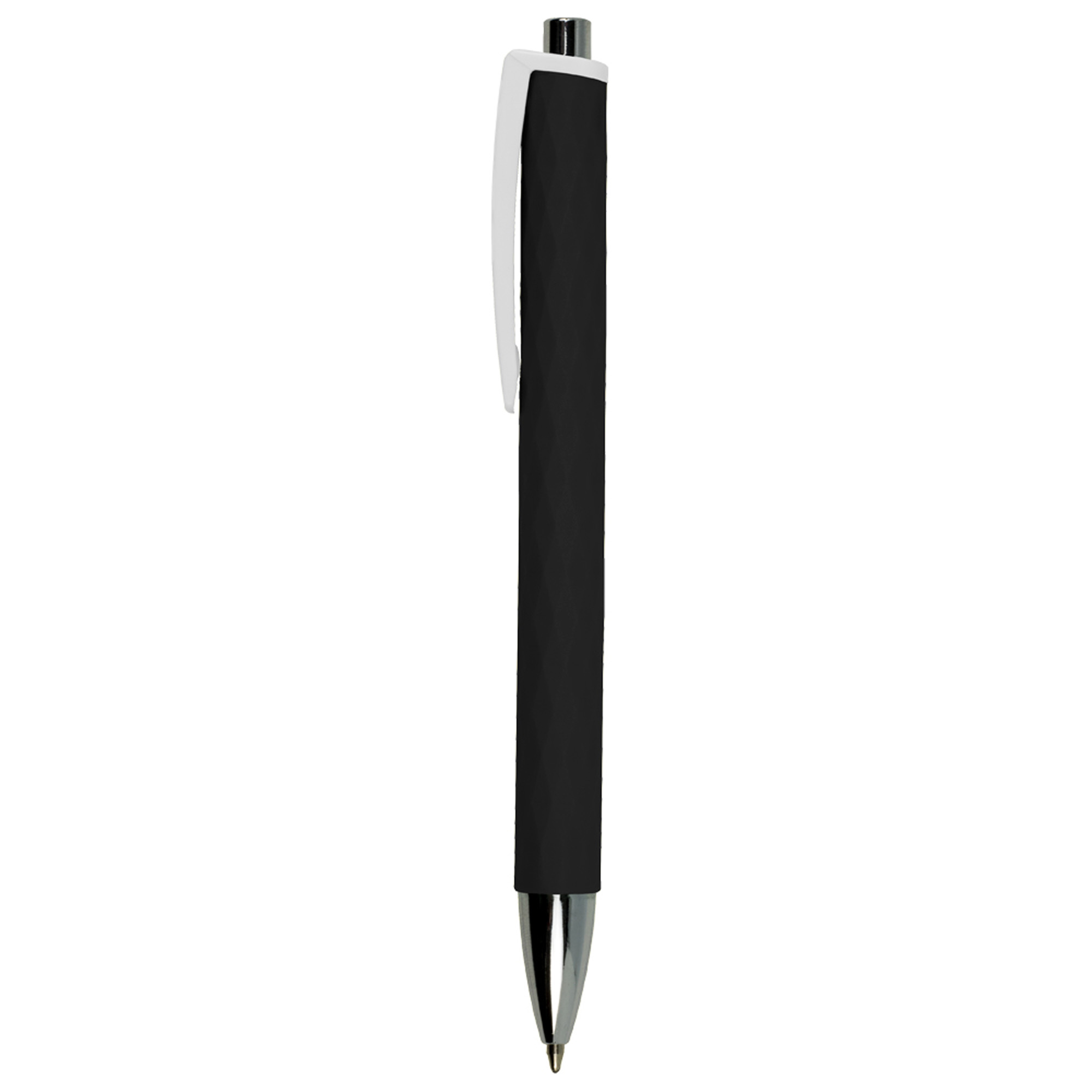 Esferográfica de plástico com clip largo. Escrita preta e sistema pulsar. O que salta à vista nesta caneta é o seu clip largo, branco e perfeito para deixar a sua marca. Se olhar com atenção, outro pormenor preza pela diferença: no corpo, um padrão de losango com textura em relevo. Não ofereça apenas uma esferográfica, aposte no destaque!