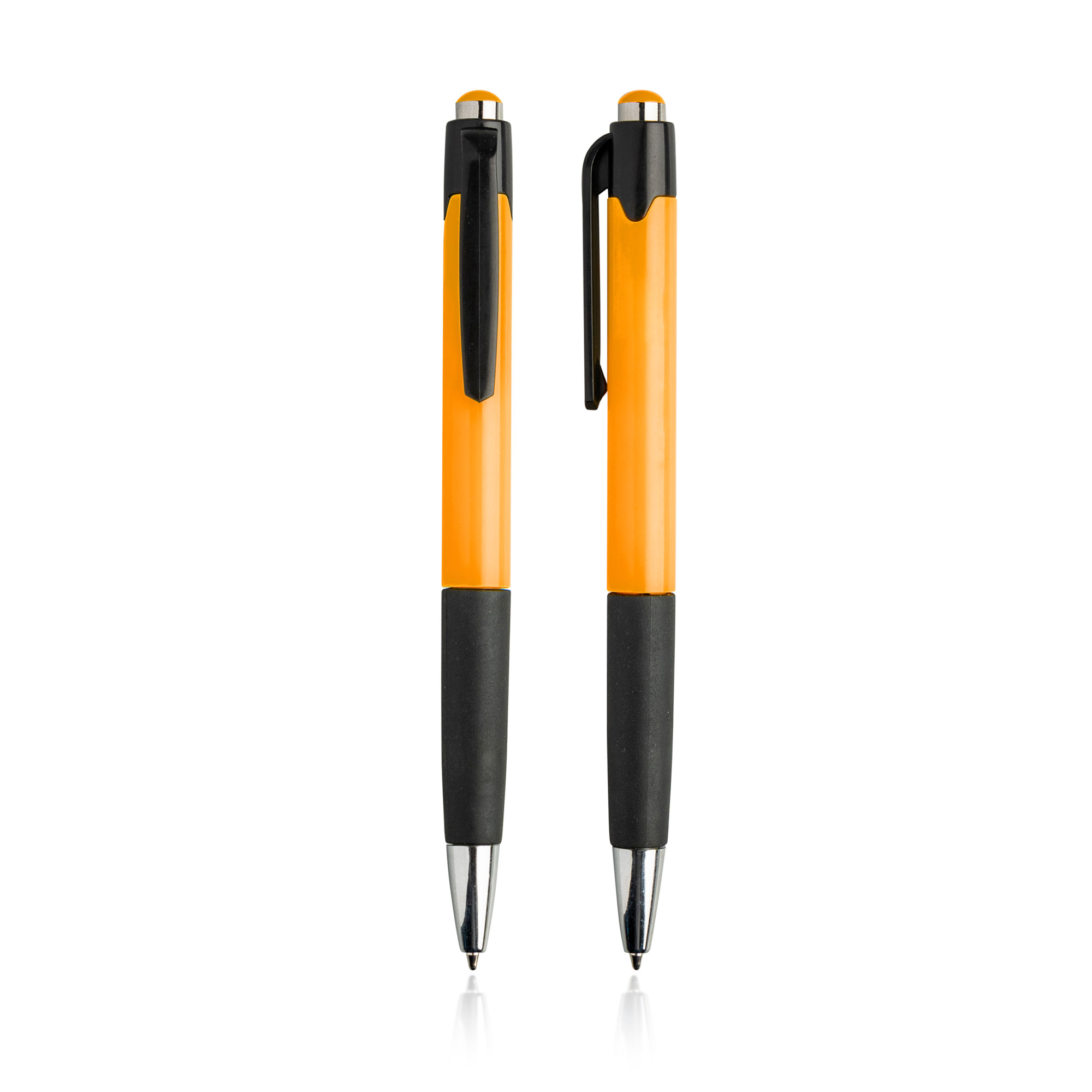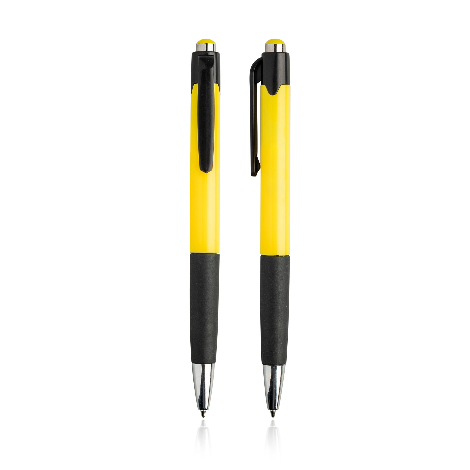 Esferográfica de plástico, pega antideslizante. Escrita azul, sistema push. Esferográfica com corpo colorido, e detalhes pretos. Ofereça um brinde útil, com a sua gravação.