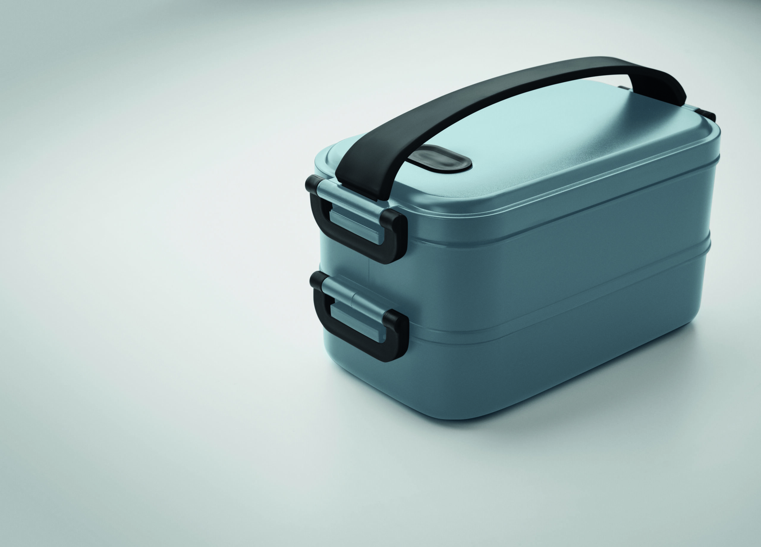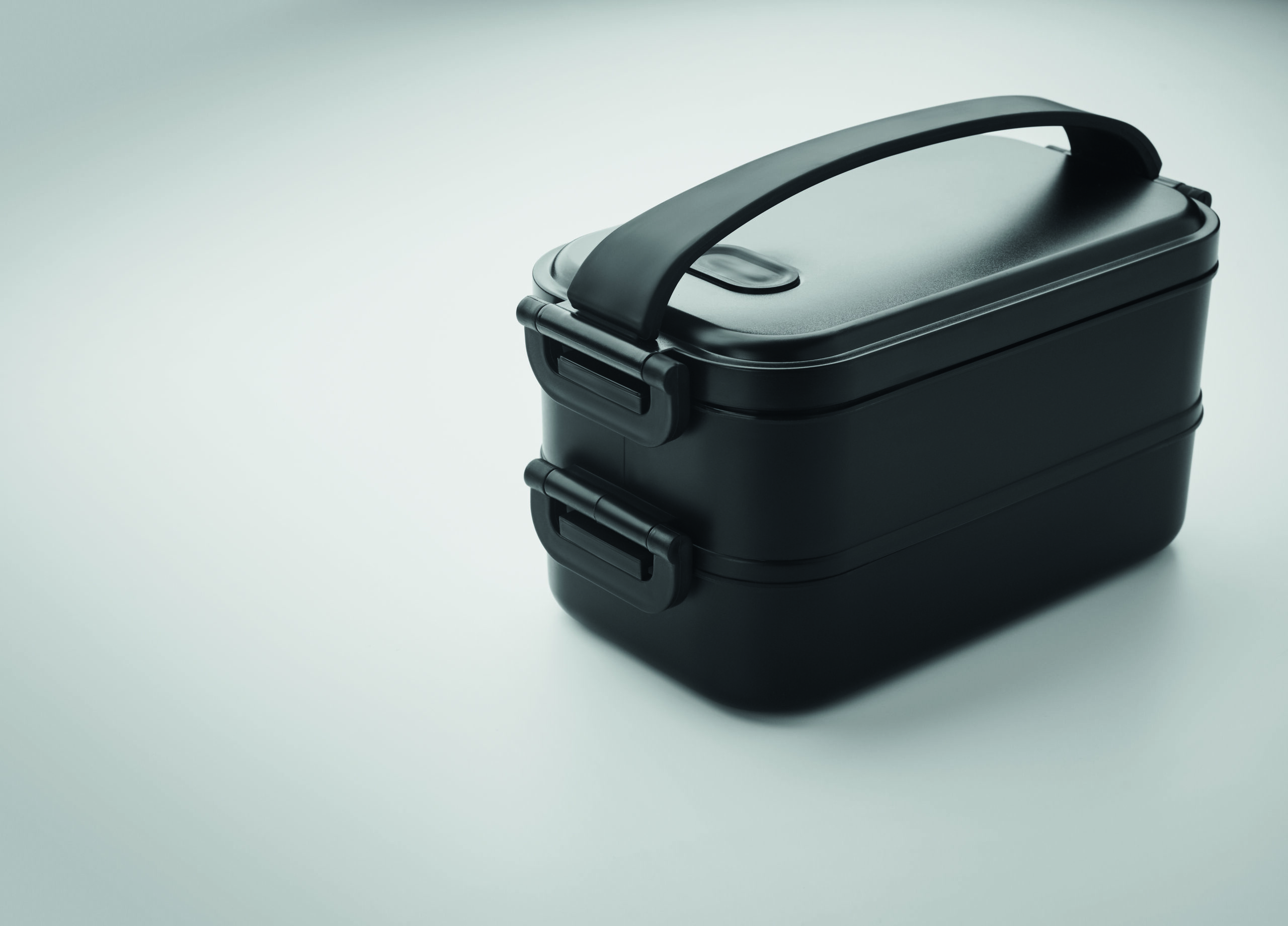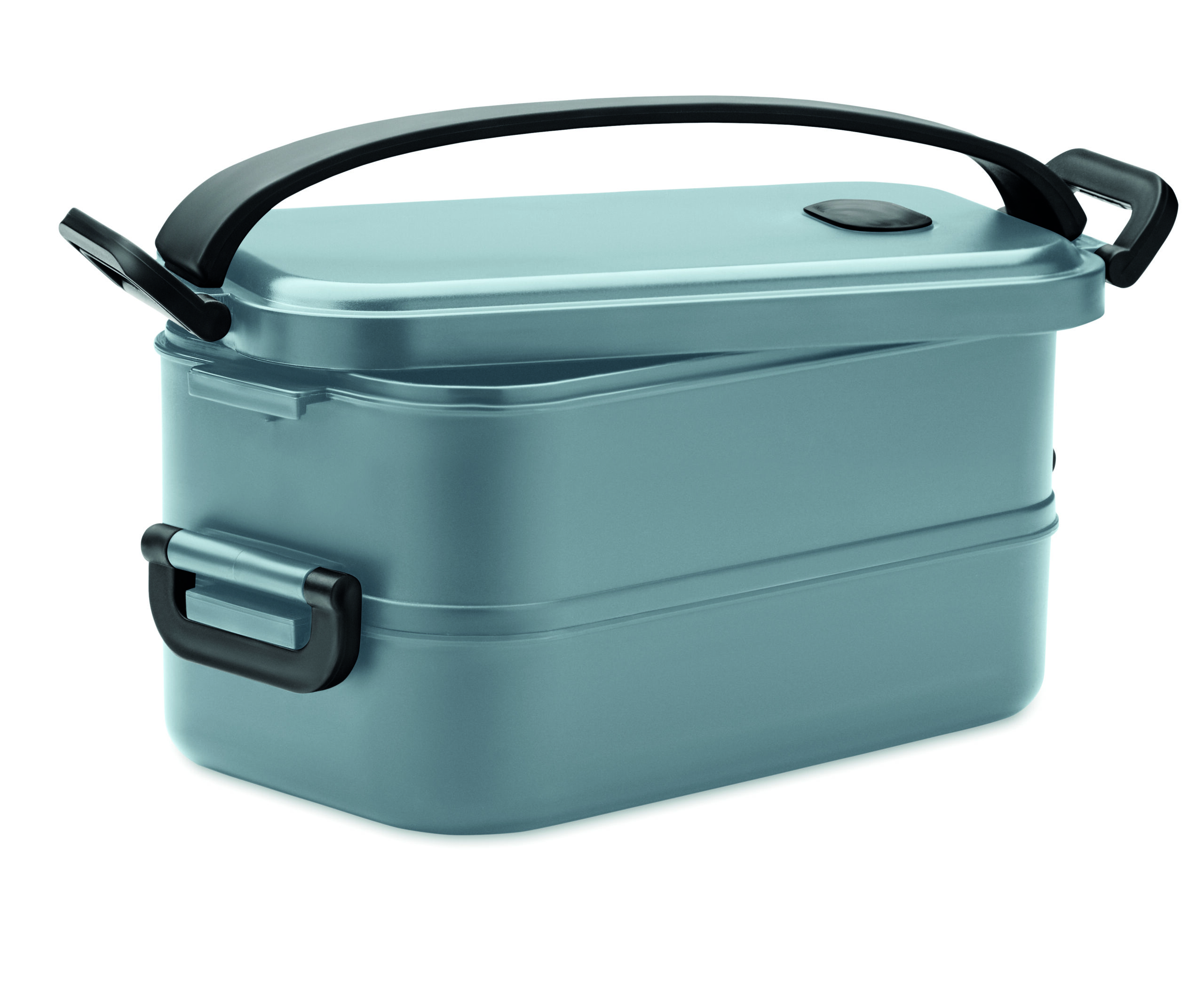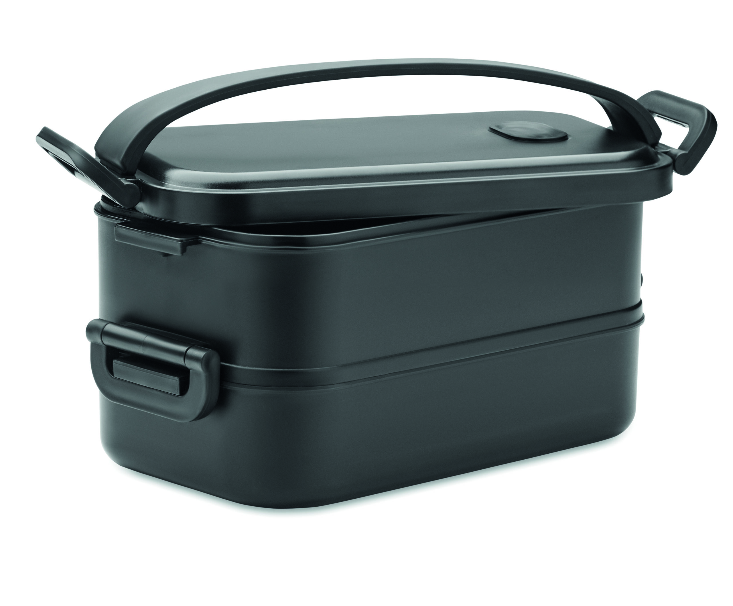 Lancheira de dois andares feita de PP com divisória removível com fivelas laterais e tampa hermética. Capacidade: 800 ml (2x).