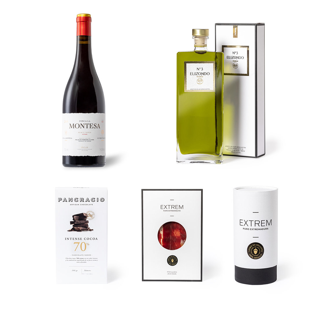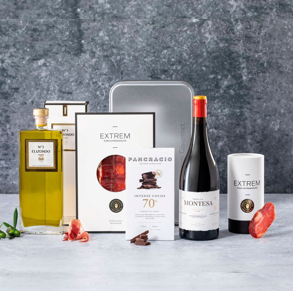 Conjunto premium gourmet: delicioso, com um design perfeito para oferecer e causar sensação. Uma seleção premium, para os paladares mais requintados, acompanhado de um packaging único que aposta no design. Inclui:Vinho tinto LA MONTESA “Álvaro Palacios” com DOCa Rioja, em garrafa de 750 ml. Um tinto radiante, de textura sedosa e boa guarda. Galardoado com vários prémios, destacando os 93 pontos Parker e a medalha de ouro nos Prémios Bacchus 2022.Presunto de bolota 100% ibérico EXTREM em embalagem de 80g, da Dehesa de Extremadura e cortado à mão.Lombo de bolota 100% Ibérico EXTREM em embalagem de 250g.Chocolate negro. 70% Intense Cocoa PANCRACIO, em tablete de 100g. Para os amantes do chocolate mais puro, surpreendente pelo seu intenso sabor e as suas delicadas notas frutadas.Azeite Virgem Extra ELIZONDO em garrafa de 500 ml. Extra precoce e de variedade Picual, de cor verde intenso, colhido nas primeiras semanas de Outubro, quando as caraterísticas organolépticas do fruto são ótimas, de extração em frio. Apresentado numa garrafa de vidro de design com tampa de segurança. Conjunto apresentado em caixa metálica Premium Gourmet de sóbrio design, protegido com estojo individual em cartão branco com distintivo Premium Gourmet.