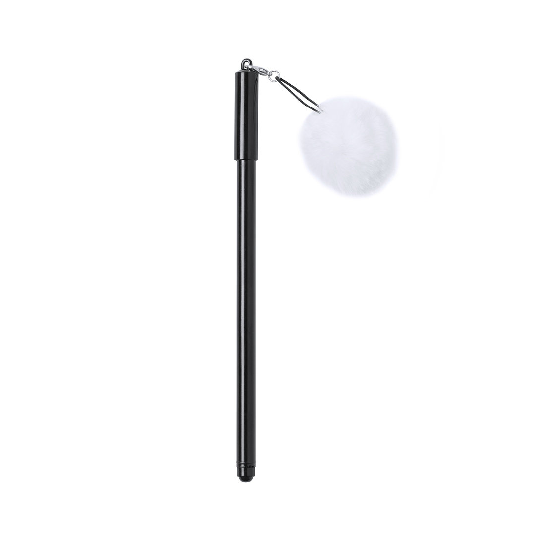 Caneta atraente com tampa com pompom e tinta gel. Corpo em preto com acabamento fosco e disponível com pompom branco ou rosa. Carga jumbo e tinta azul.