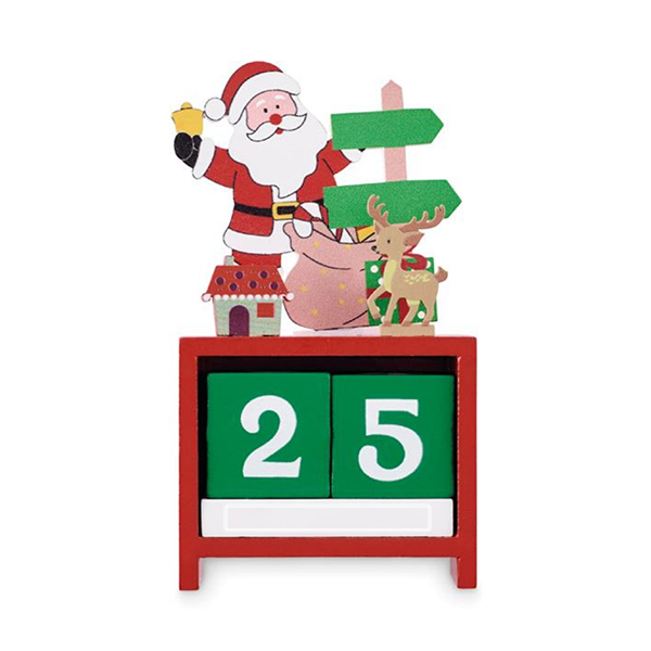 Calendário de secretária em madeira com contagem decrescente para o Natal.
