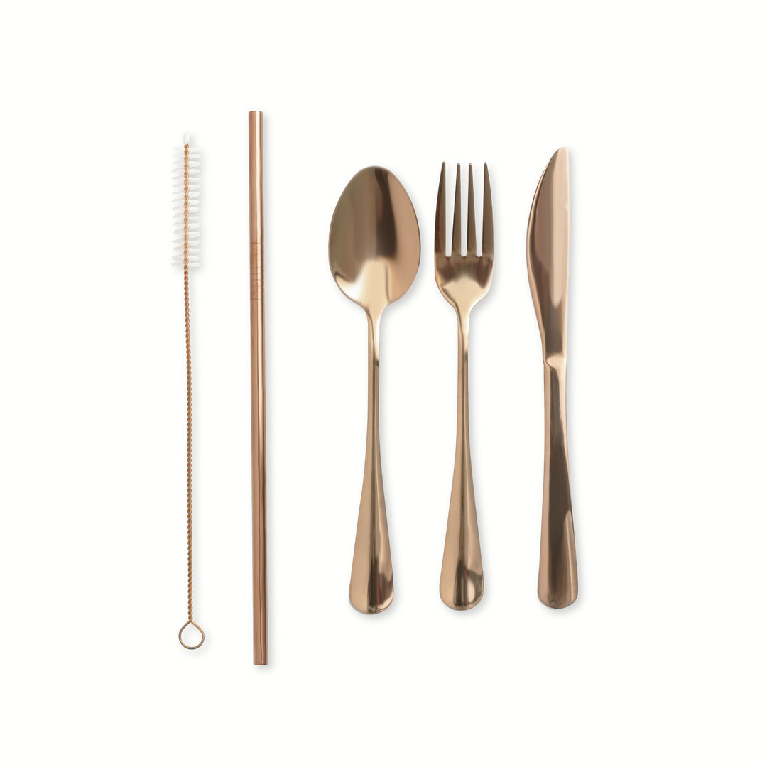 Conjunto de talheres de 5 peças fabricadas em aço inox com revestimento de cobre galvanizado. Inclui colher, garfo, faca, palha reutilizável e escova de limpeza para a palha. Apresentação em bolsa de veludo preta com fecho de cordão.