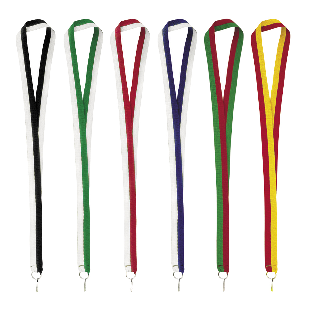 Fita bicolor para medalhas em terylene. Toda a medalha merece uma fita à altura. Com várias combinações de cores e mosquetão metálico. Escolha a opção que mais se adapta à sua competição.