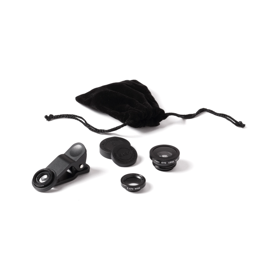 Conjunto de 3 lentes universais para smartphone, ajustáveis ​​à câmera através de clip. Lentes de alumínio e vidro, com efeitos – olho de peixe – macro – e gran angular -, com pano de limpeza em microfibra e apresentadas num saco de veludo com fecho de cordões. Conjunto apresentado em caixa de design atrativo.