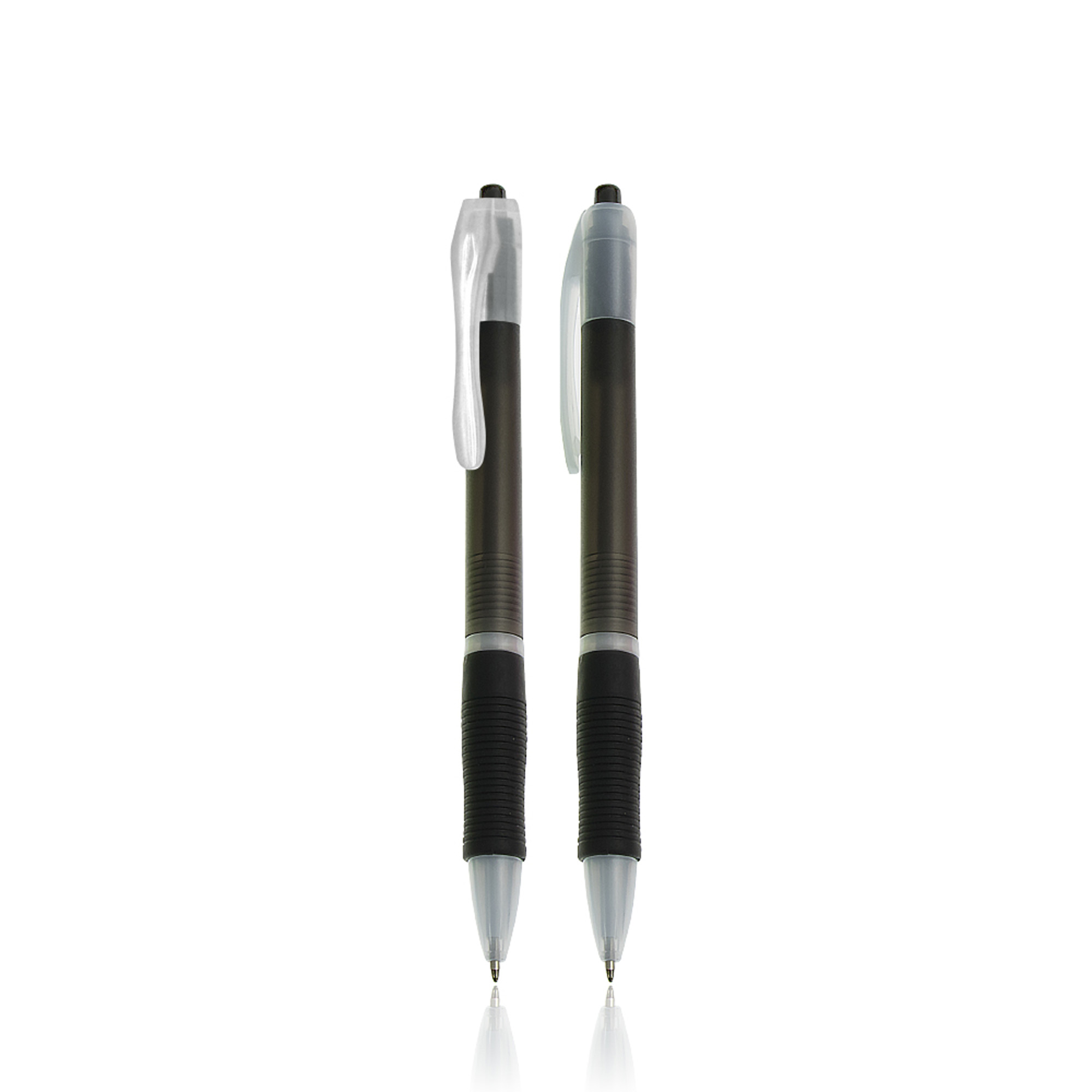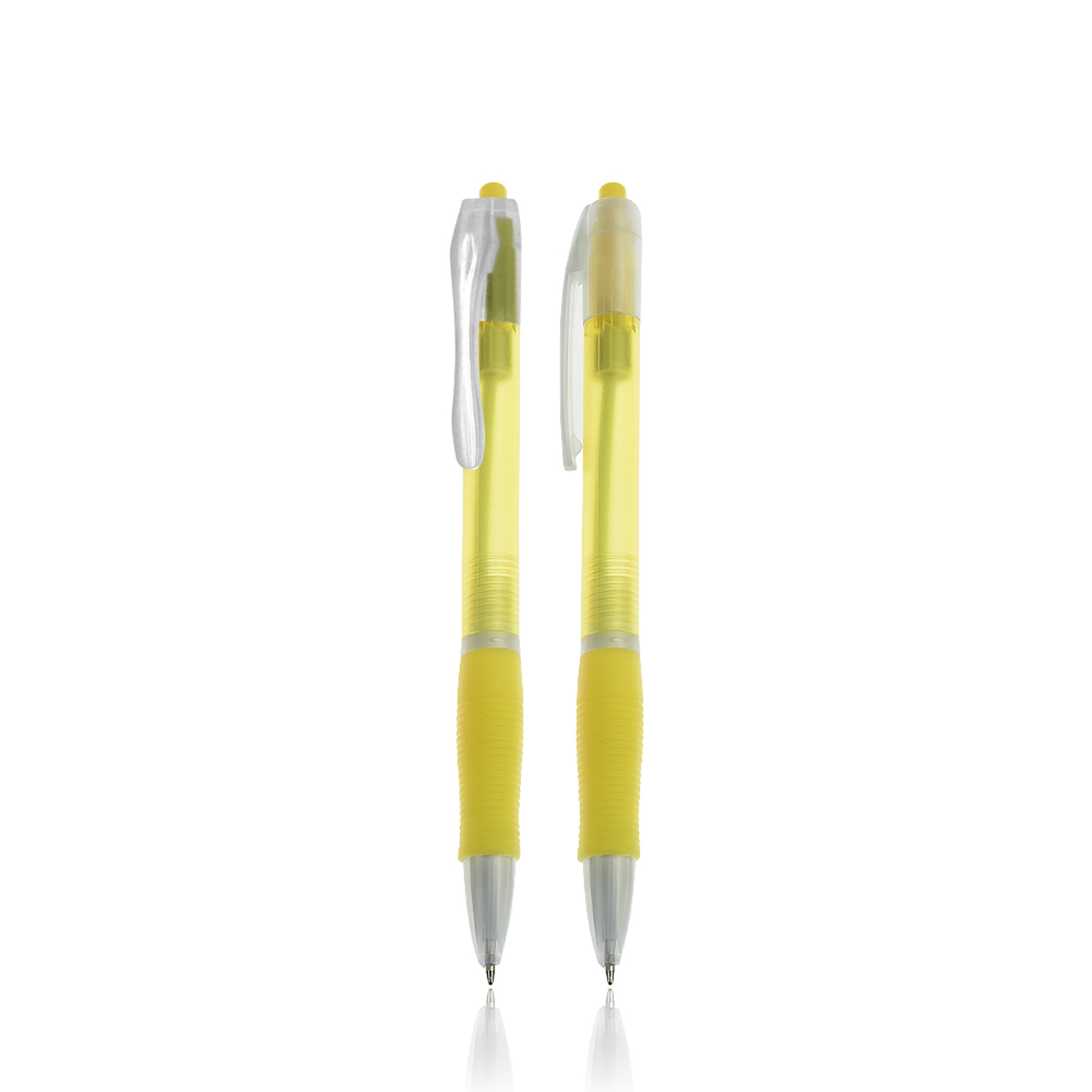 Esferográfica de plástico, pega ergonómica. Escrita preta, sistema pulsar. Esferográfica com pega colorido e corpo colorido translucido. Detalhes translúcidos. Divulgue a sua marca com este brinde.