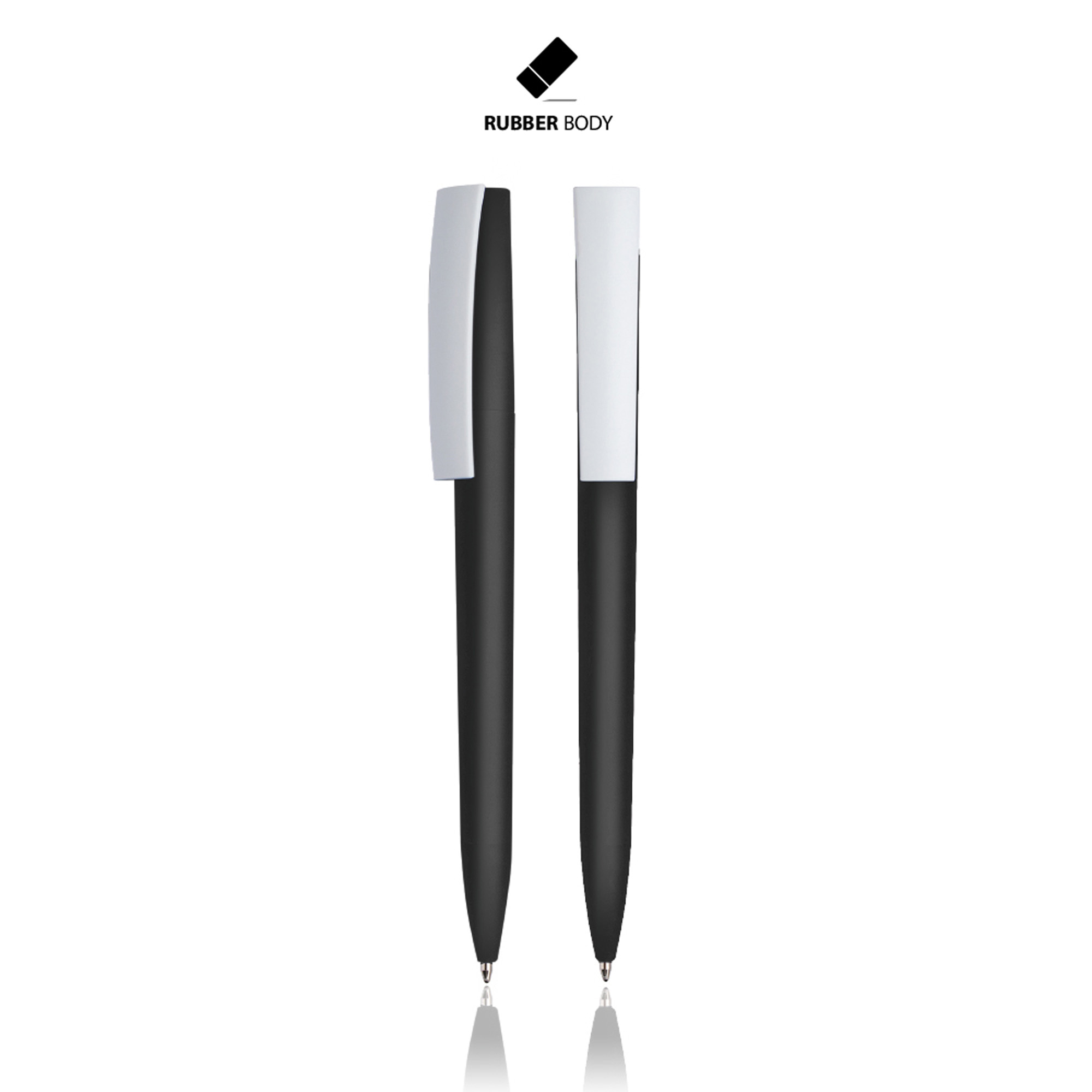 Esferográfica em plástico, acabamento em borracha. Nesta esferográfica encontra um clip ideal para gravar a sua marca. Com sistema pulsar. Esta esferográfica é de escrita preta.