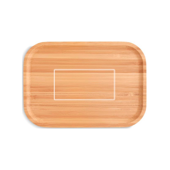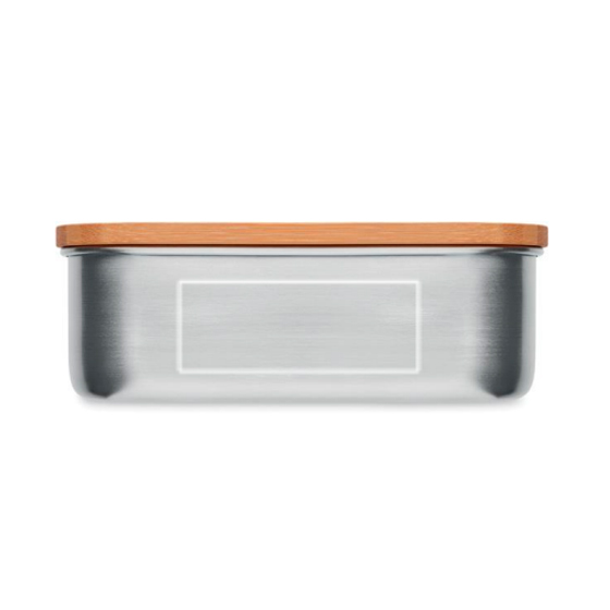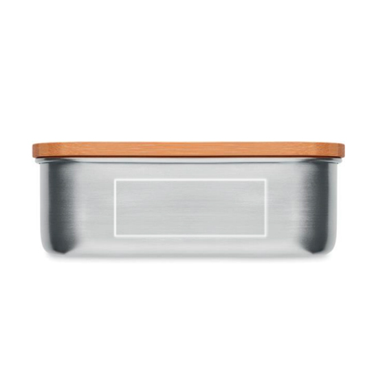 Lancheira de aço inoxidável com tampa de bambu e 2 talheres com banda de poliéster acoplável. Capacidade 600ml. O bambu é um produto natural pode haver pequenas variações de cor e tamanho por item, o que pode afetar o resultado final da impressão.