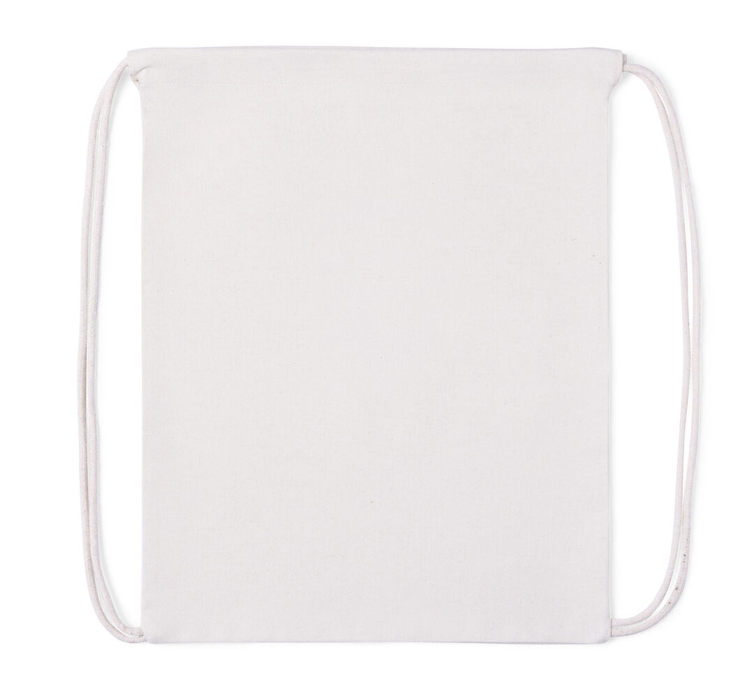 Mochila de cordas de linha nature fabricada em 100% algodão de 180g/m2 em acabamento natural. Compartimento principal com cordões em algodão.