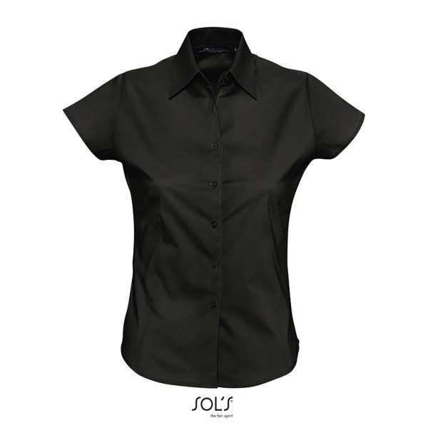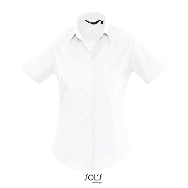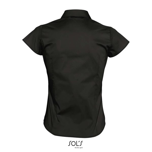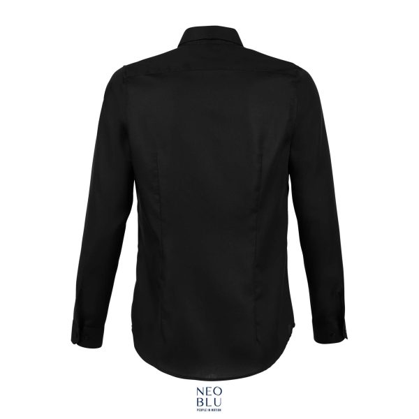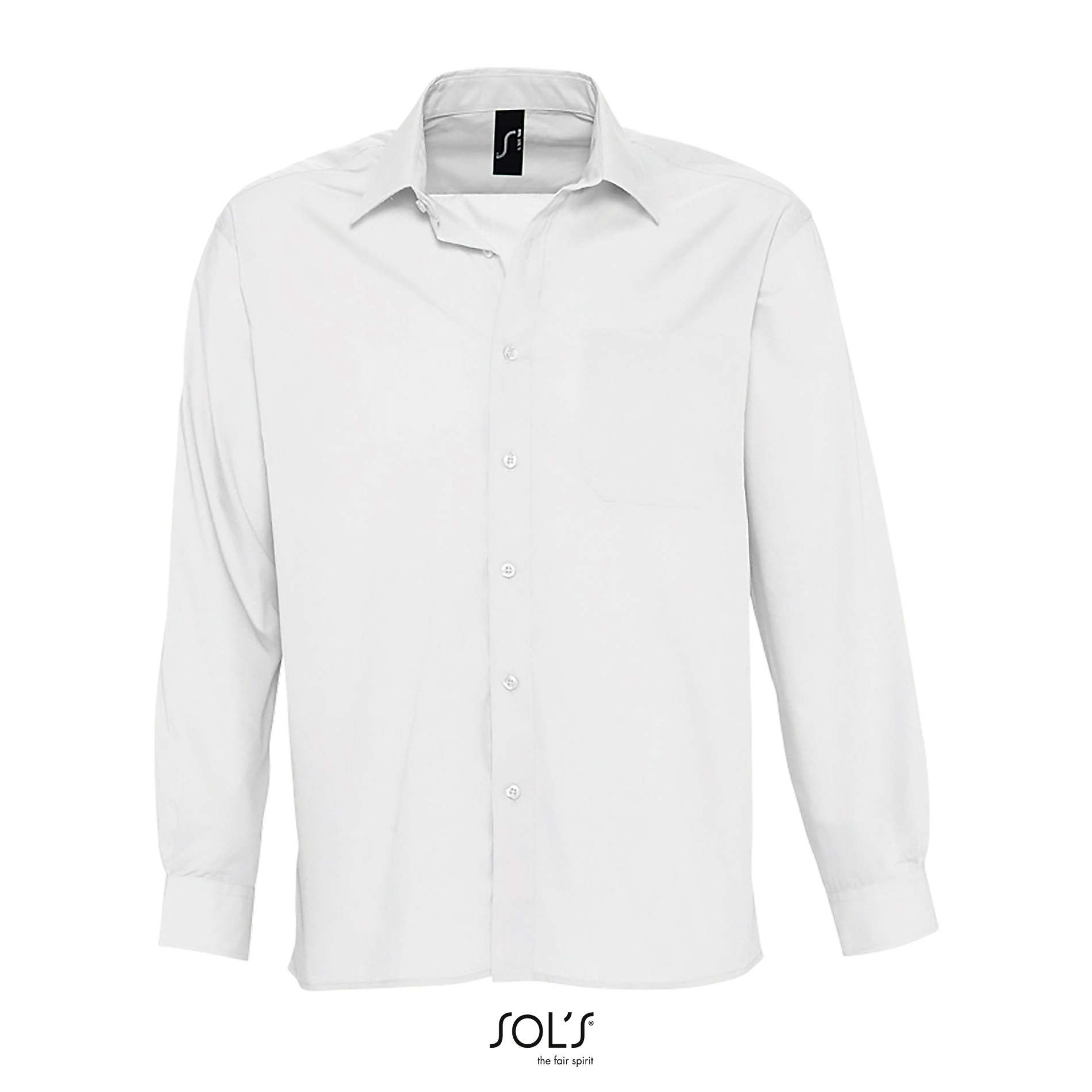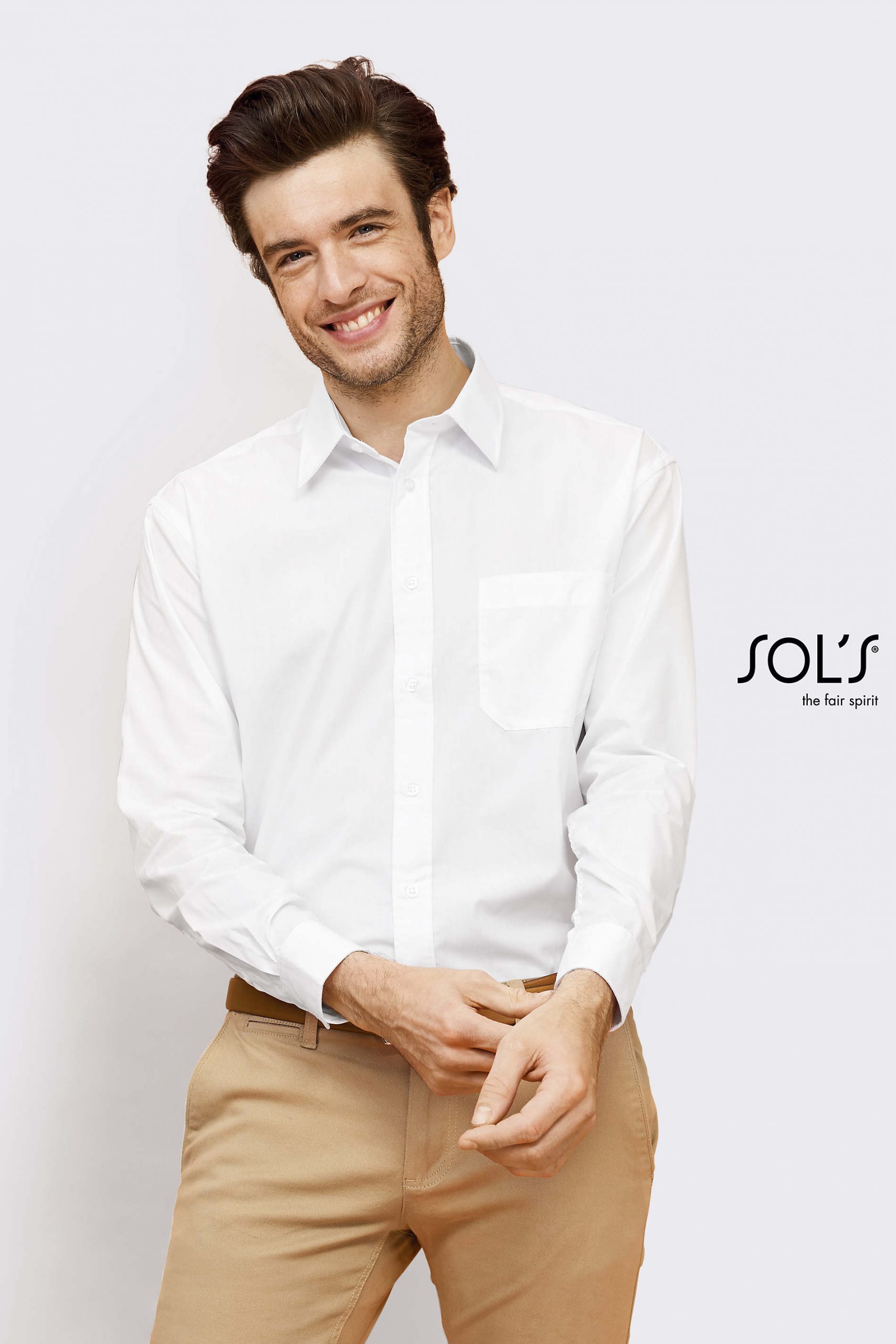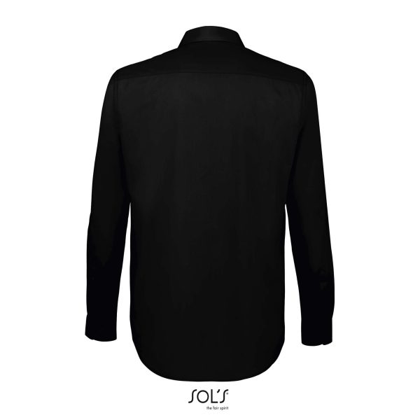 Corte direito – Manga comprida – Colarinho reforçado – Punhos ajustáveis com 2 botões e carcela – Carcela com 7 botões à cor – Bolso do lado esquerdo – 2 pinças confortáveis nas costas
