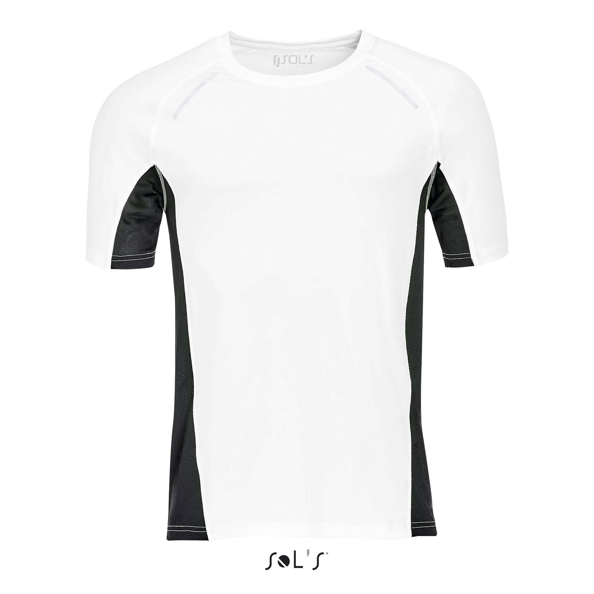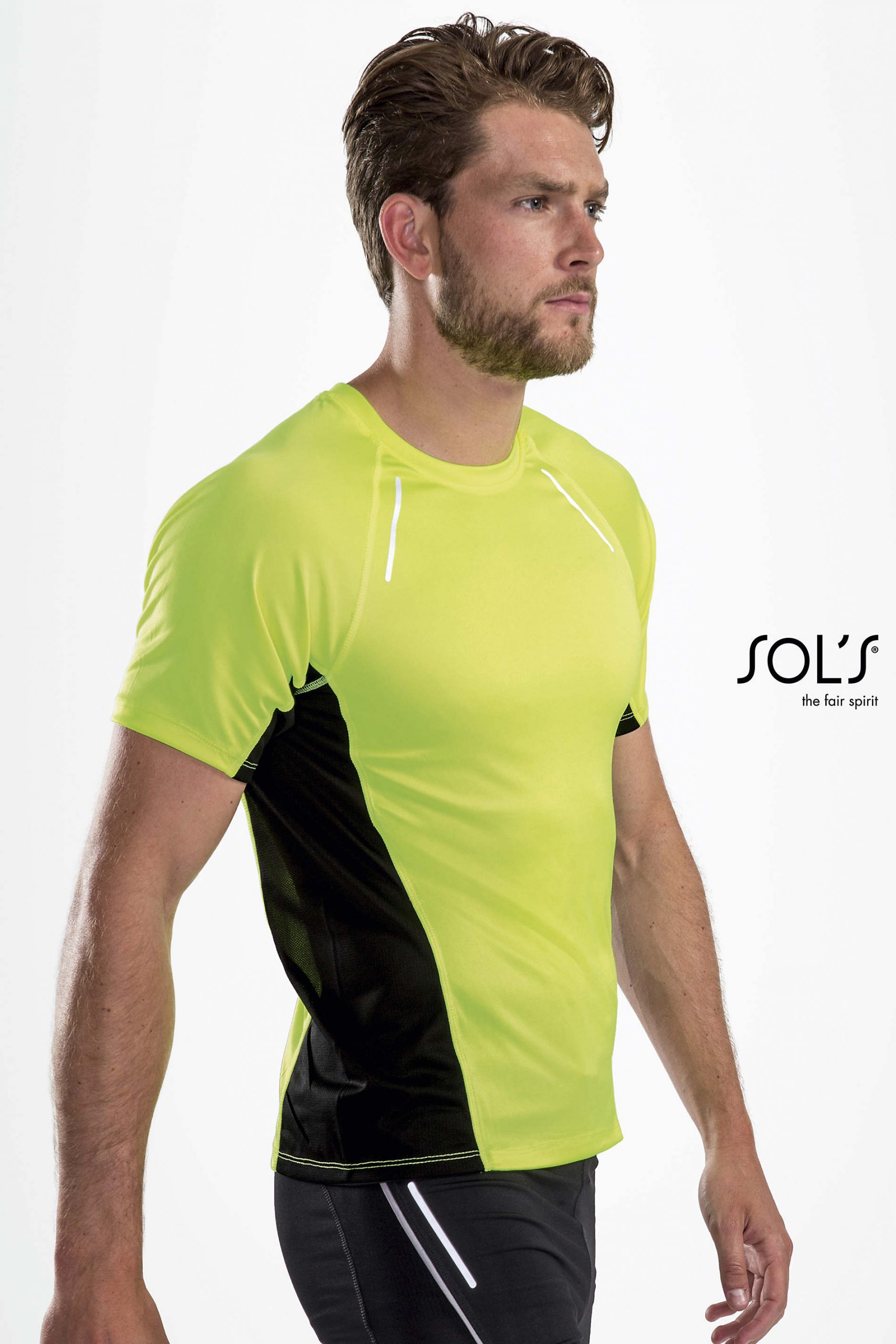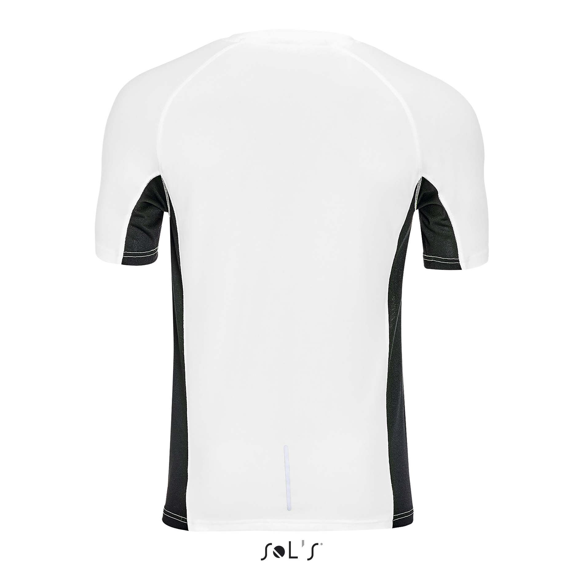 Gola redonda – Mangas raglã – Costuras flatlock – Painéis respiráveis em rede nas laterais – Detalhes refletores