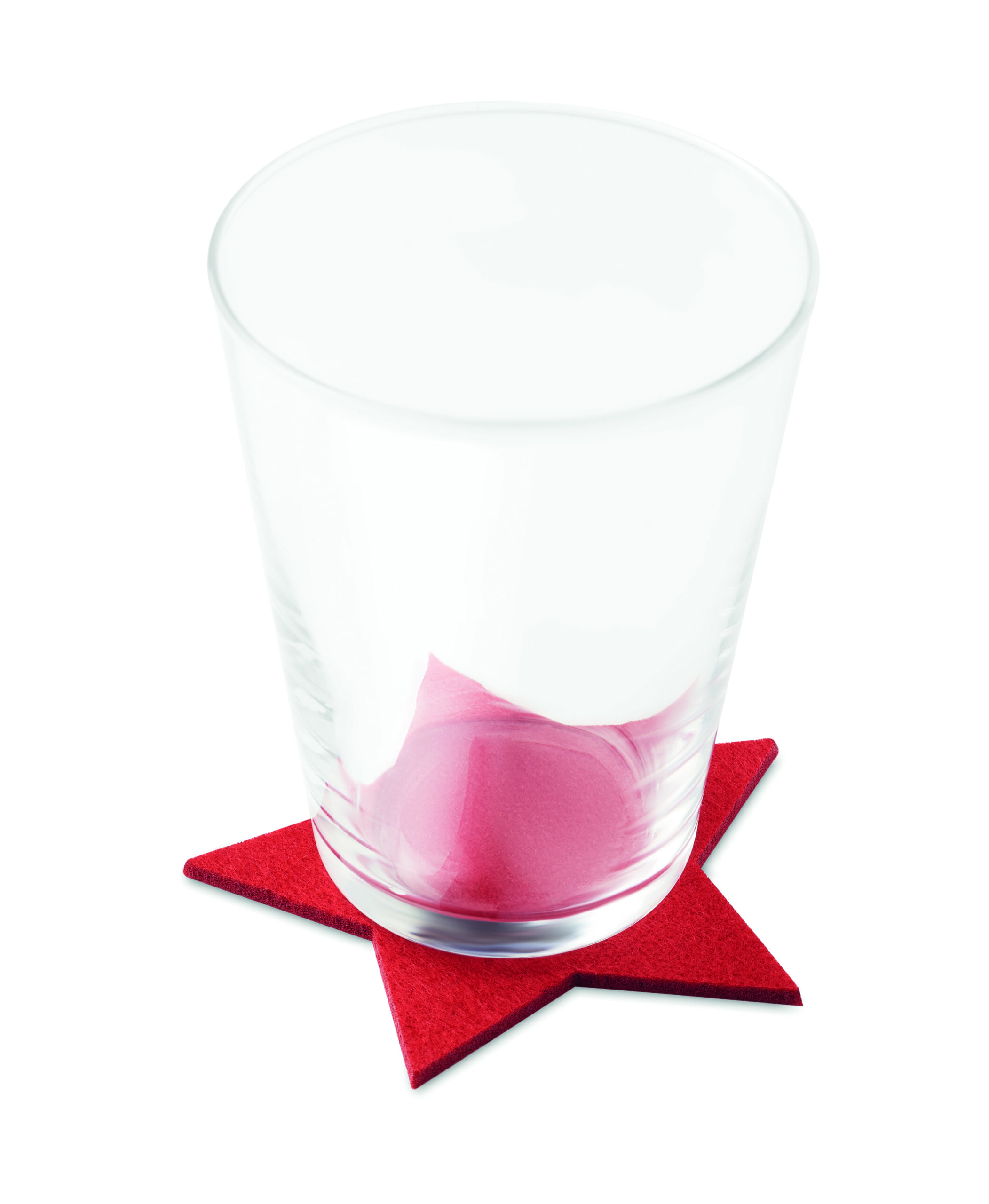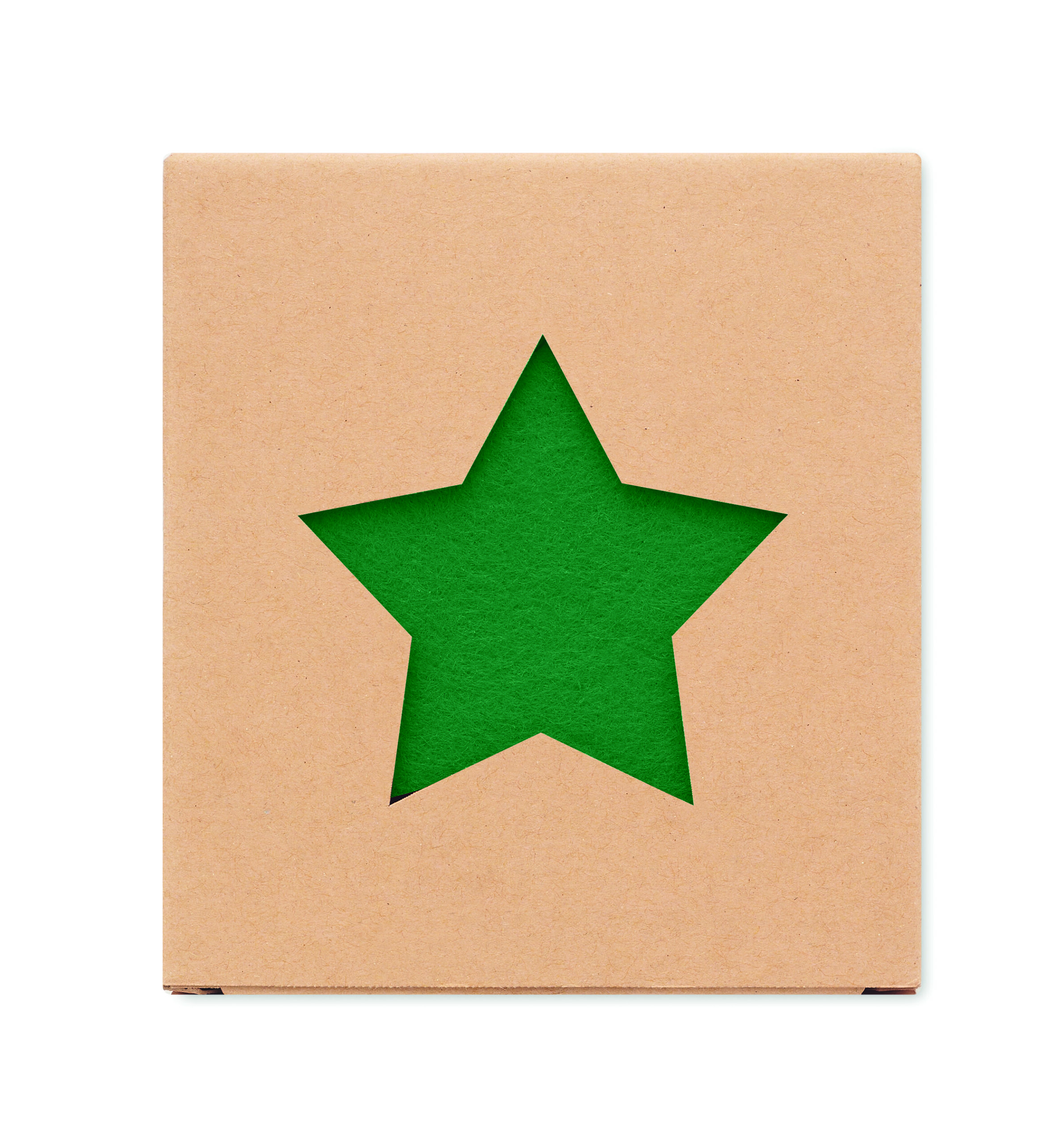Conjunto de 4 bases para copos de feltro RPET em forma de estrela apresentado numa caixa de kraft.