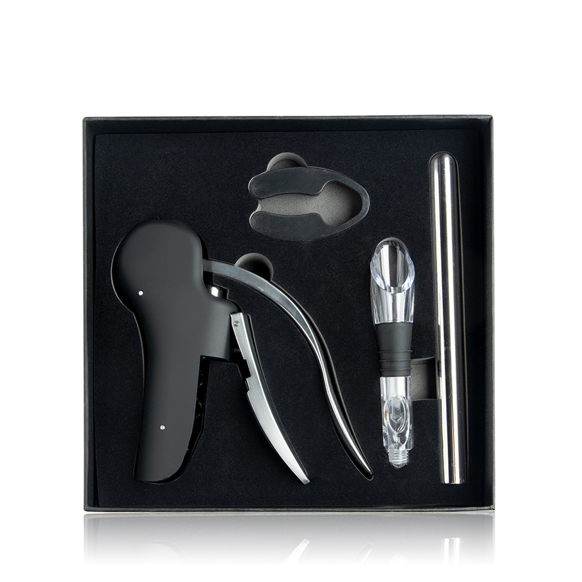 Set de vinho em aço inoxidável, com saca-rolhas, refrigerador e corta-cápsulas. Um kit de vinho glamoroso, em aço inoxidável, composto por três peças com as seguintes funções: saca-rolhas, corta-cápsulas e refrigerador. O produto também tem função de oxigenat e arejar de vinhos. Como brinde completo, este kit vem numa caixa de oferta preta, que pode personalizar com o seu design.