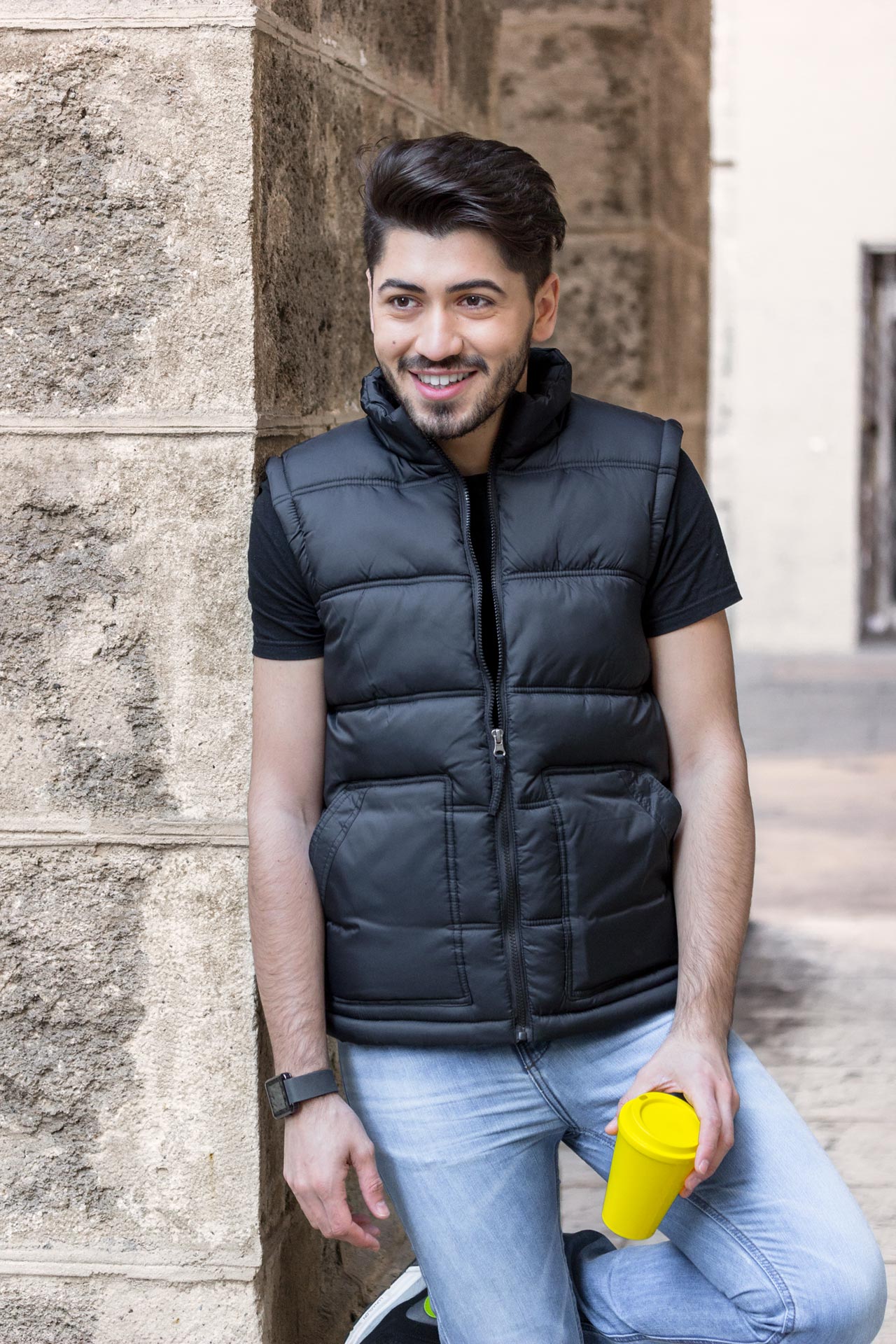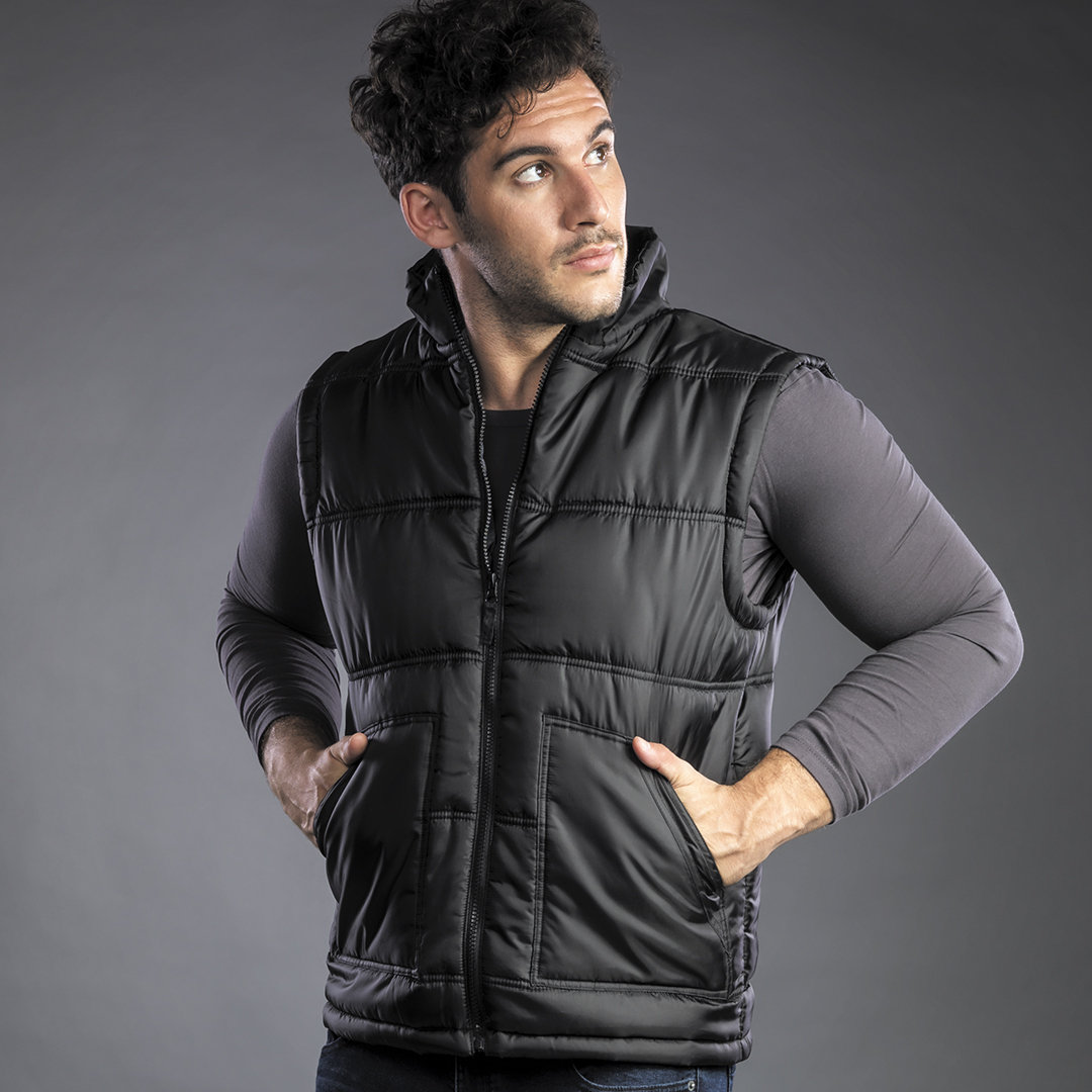 Colete em suave material, combinação de nylon e poliéster. Com acolchoado em PET reciclado, fecho éclair com fita no puxador e amplos bolsos laterais. Disponível nos tamanhos M, L, XL e XXL.