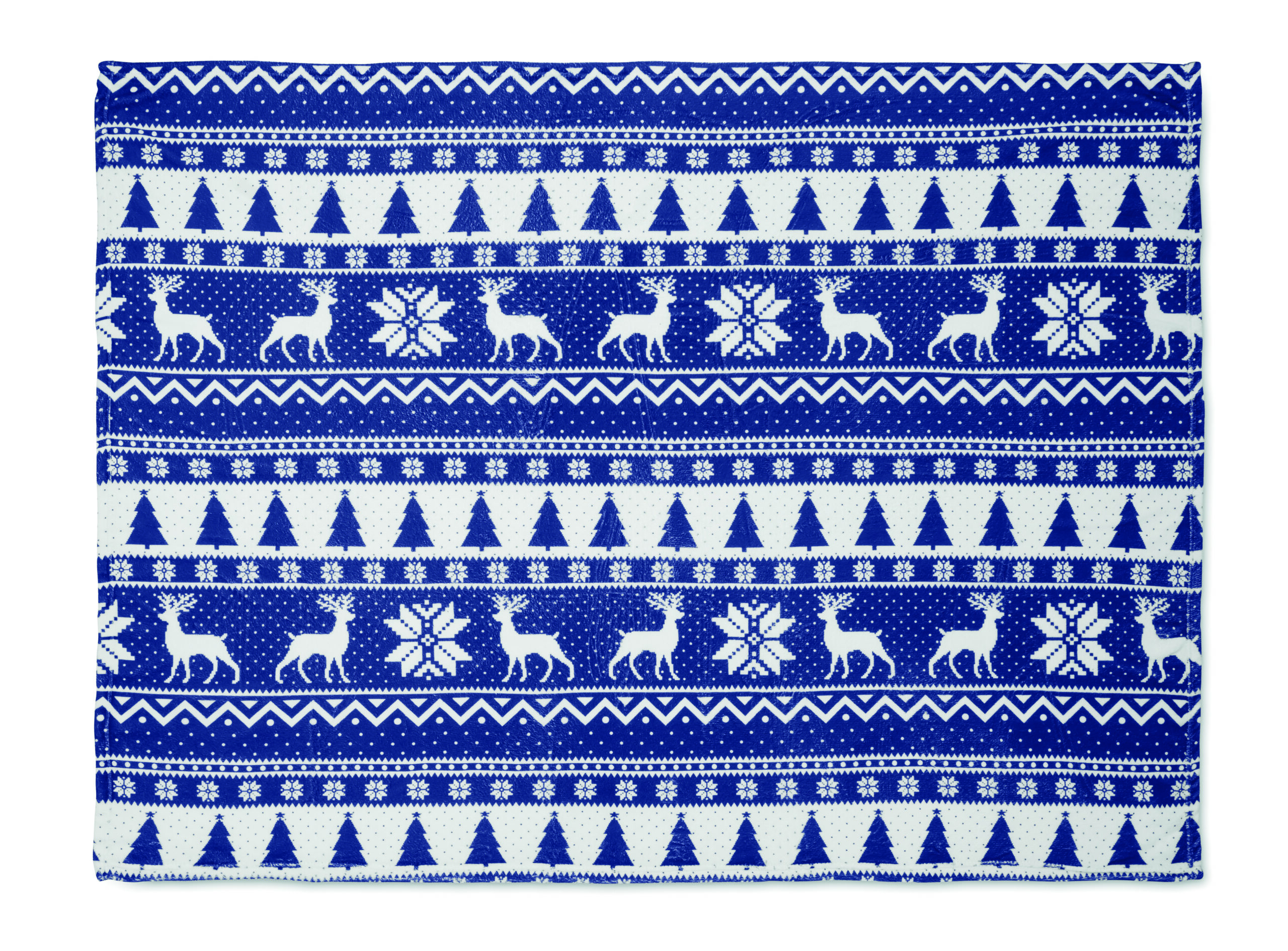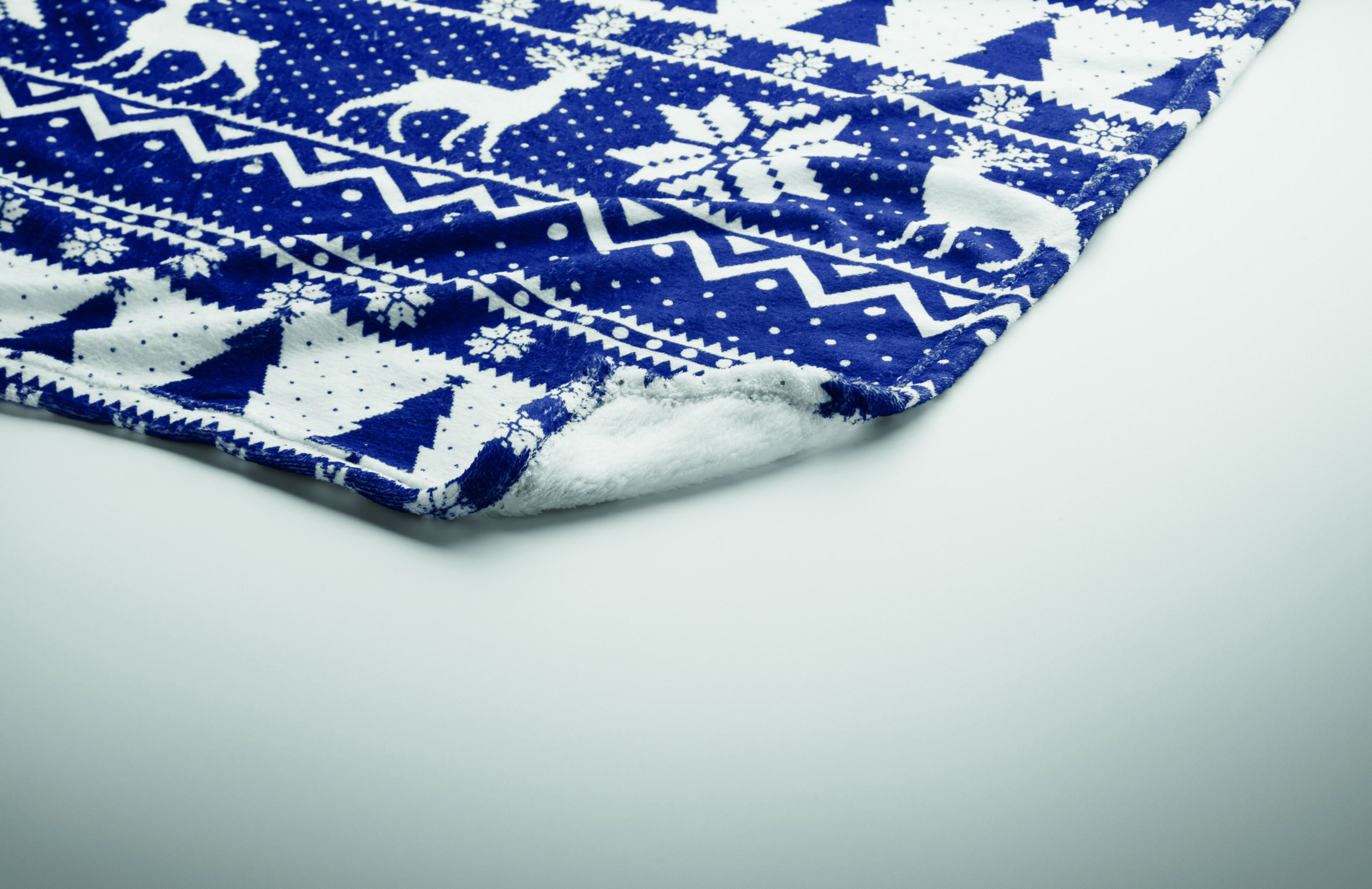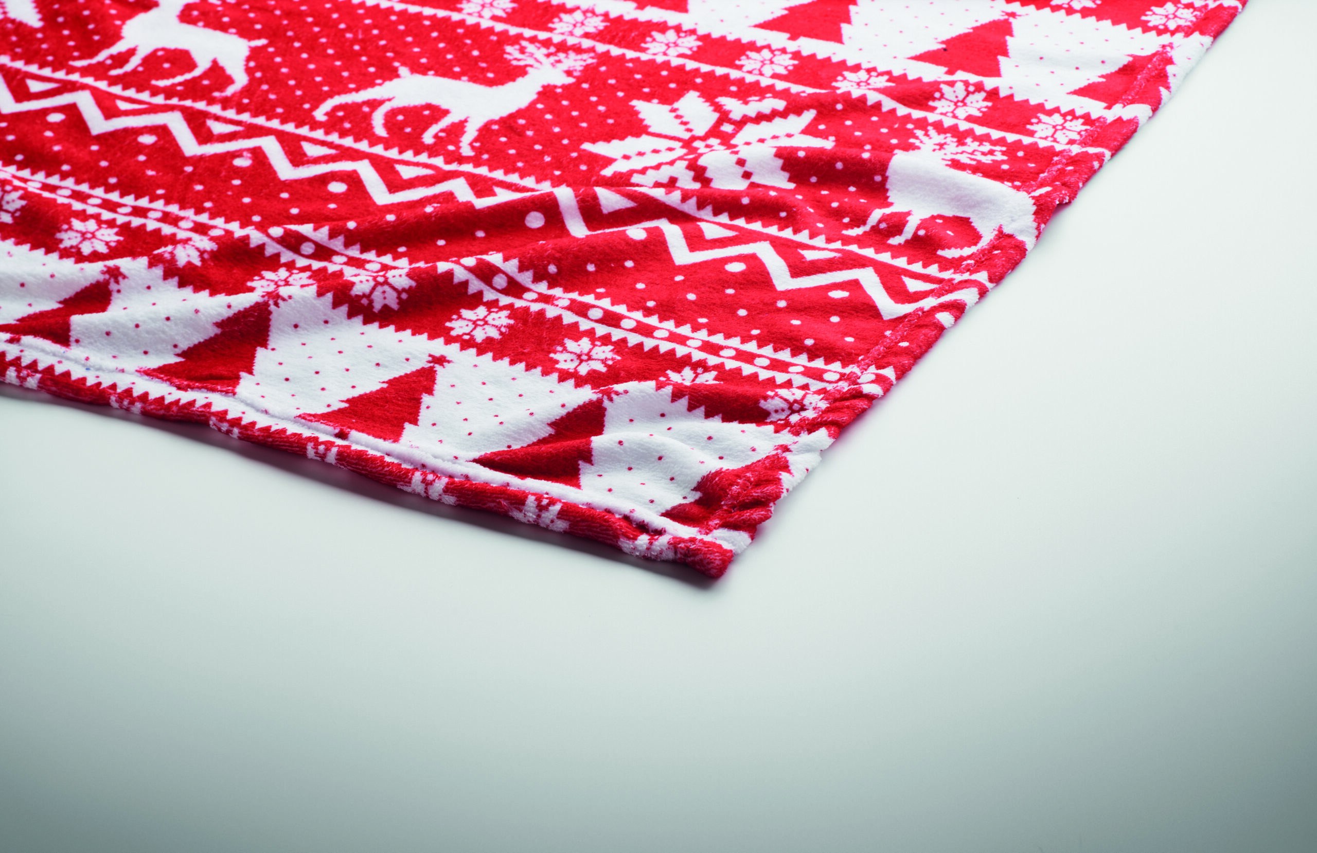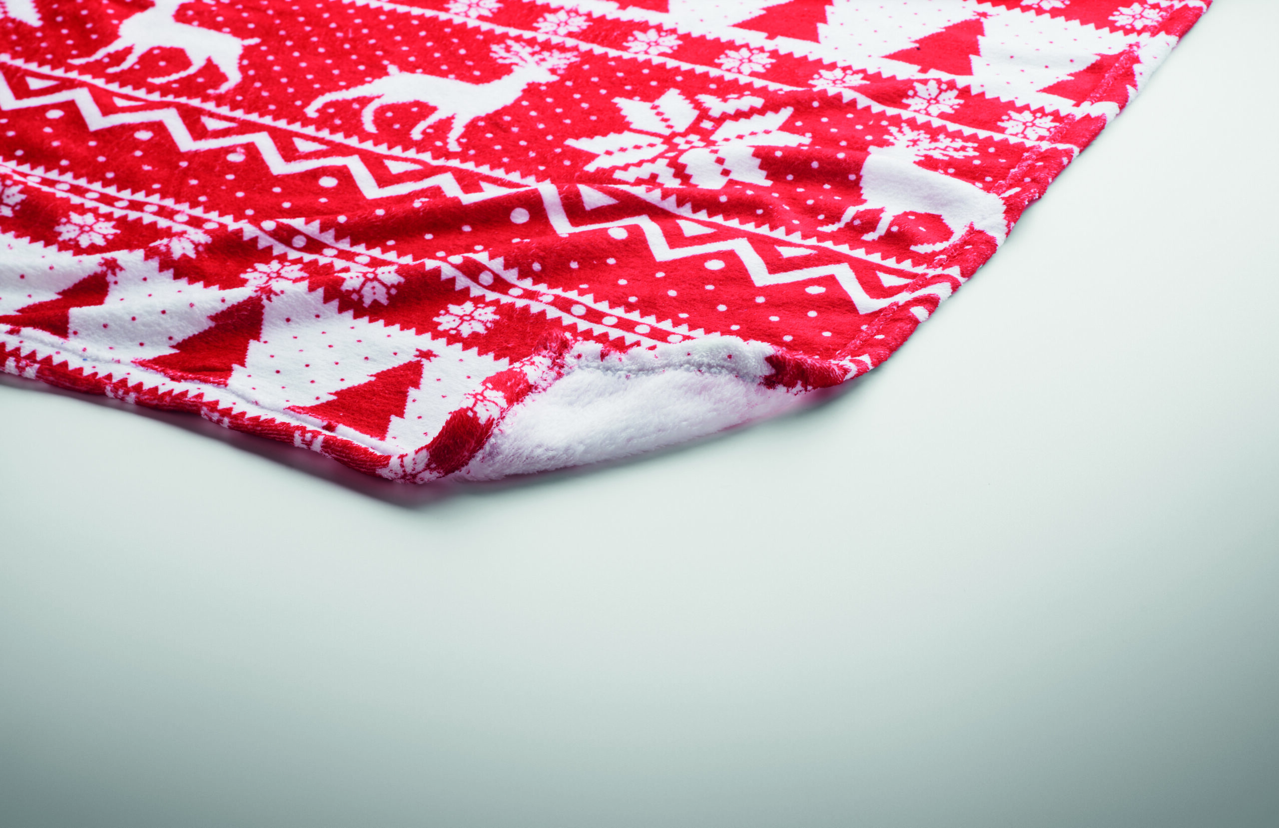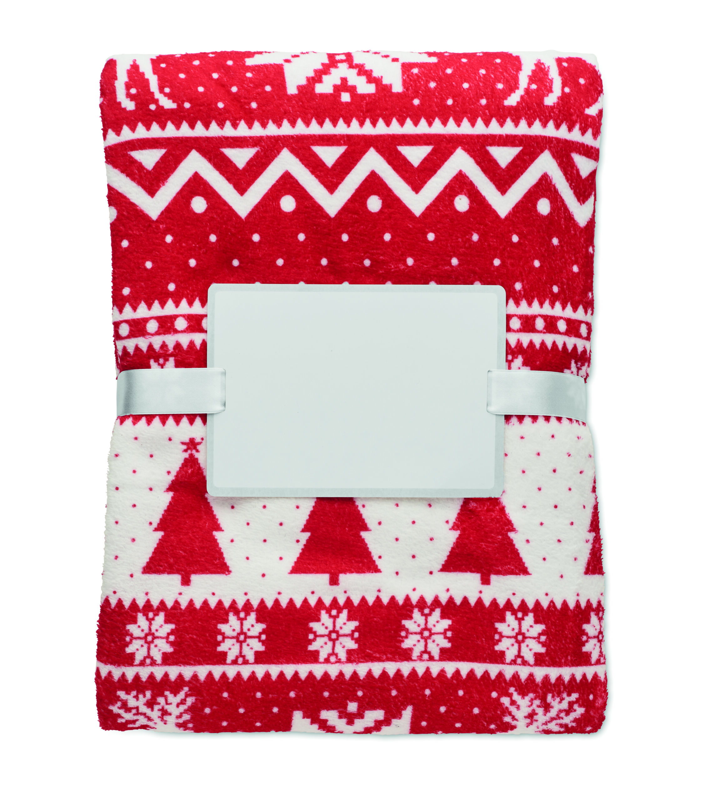 Manta polar RPET coral de 190 gr/m² com padrão de inverno. Embrulhado em fita e cartão para impressão.