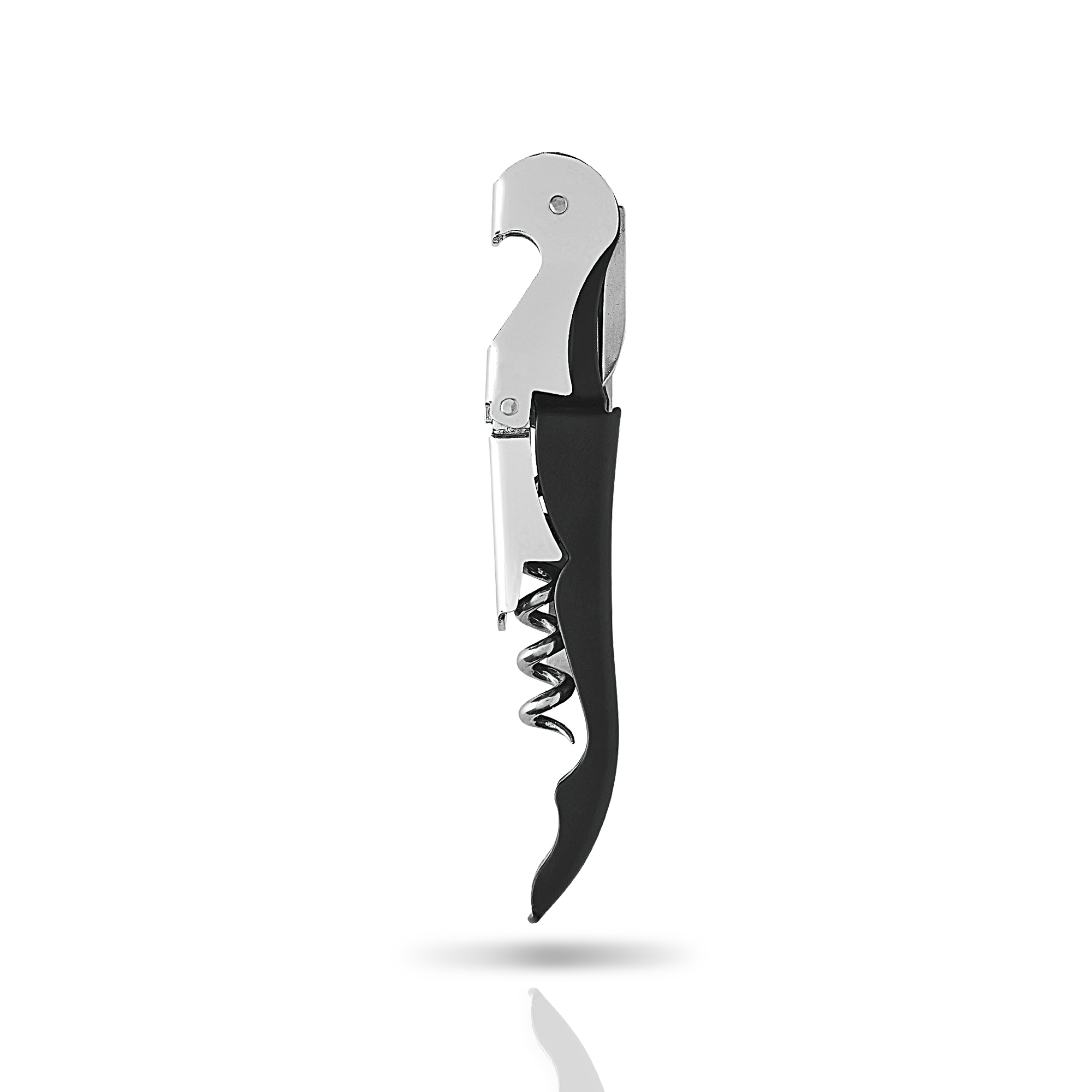Saca-rolhas 2 tempos. Numa combinação entre plástico e aço inoxidável, este saca-rolhas clássico e elegante vai completar a sua mesa do jantar. Personalize-o para um toque mais especial. Caixa branca de oferta.