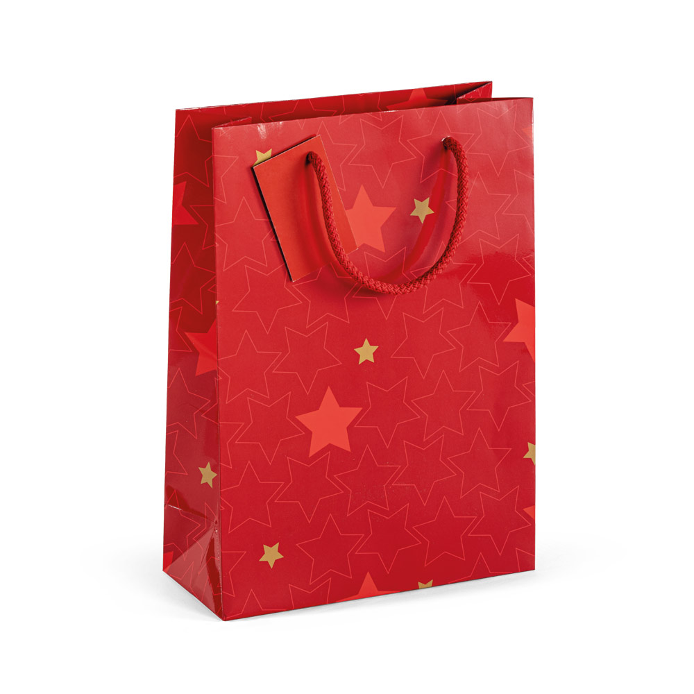 Saco médio em papel couché com plastificação brilhante (170 g/m²). Com base em cartolina e cartão para personalização