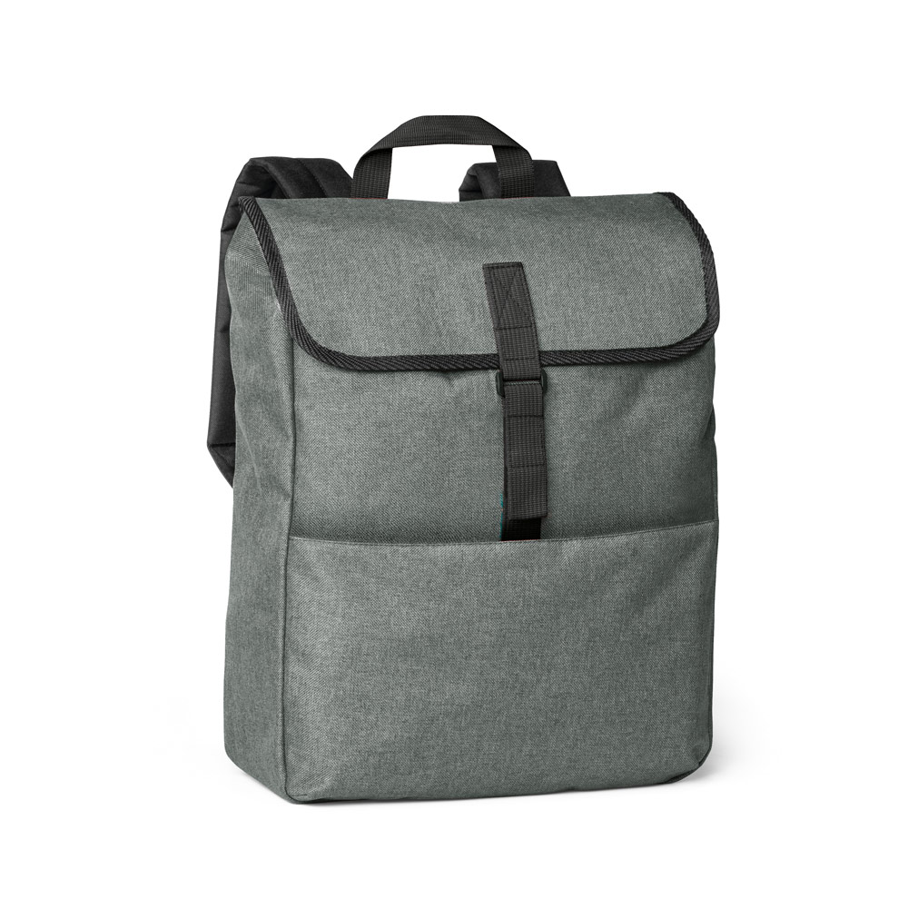 Mochila para portátil em 600D de alta densidade. Compartimento principal com divisória almofadada para portátil até 15.6″. A mochila tem bolso frontal com fecho. Parte posterior e alças almofadadas. Capacidade até 10L