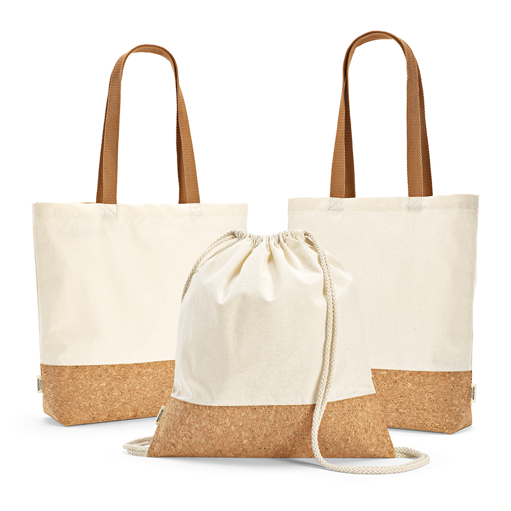 Esta saco combina algodão reciclado (70% algodão reciclado e 30% rPET), ancorada por um fundo de cortiça durável.