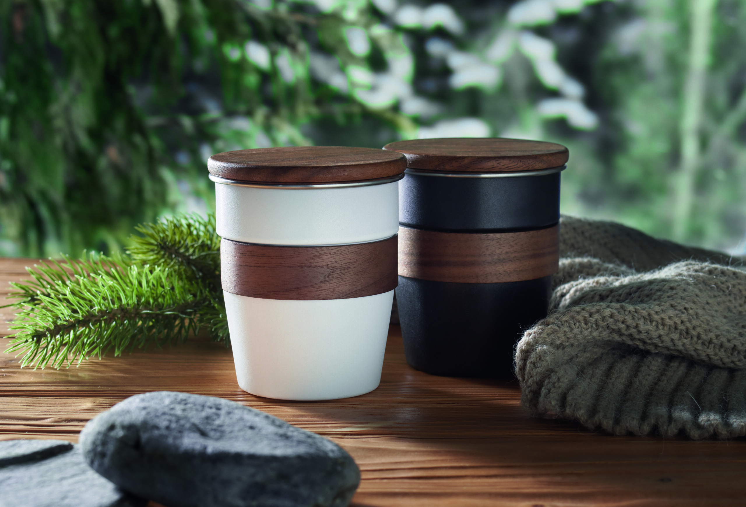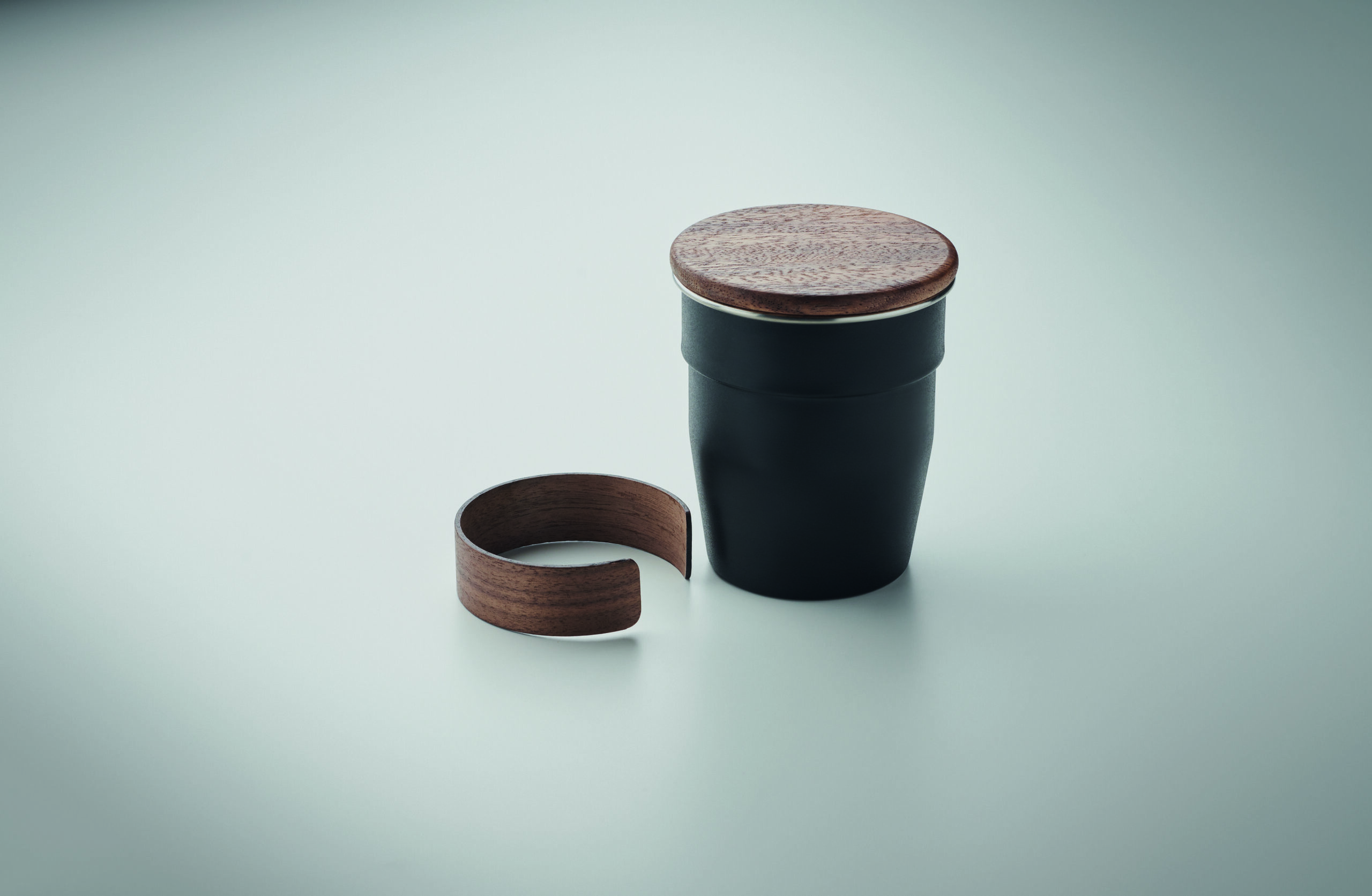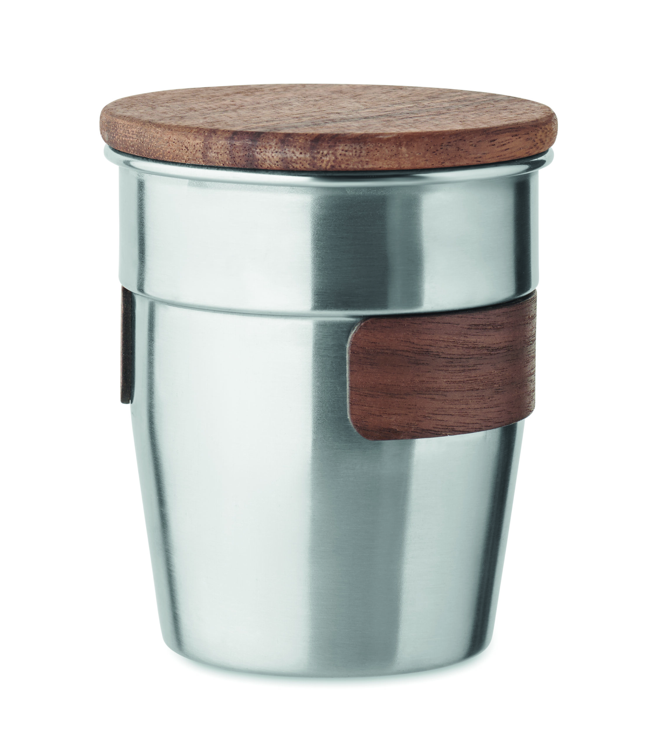 Copo de parede simples em aço inoxidável reciclado (90% aço inoxidável reciclado e 10% aço inoxidável) com pega e tampa em nogueira. Capacidade: 350ml. Remova a alça para limpeza. Como se trata de uma caneca de parede única, a transferência de calor ainda pode ocorrer.