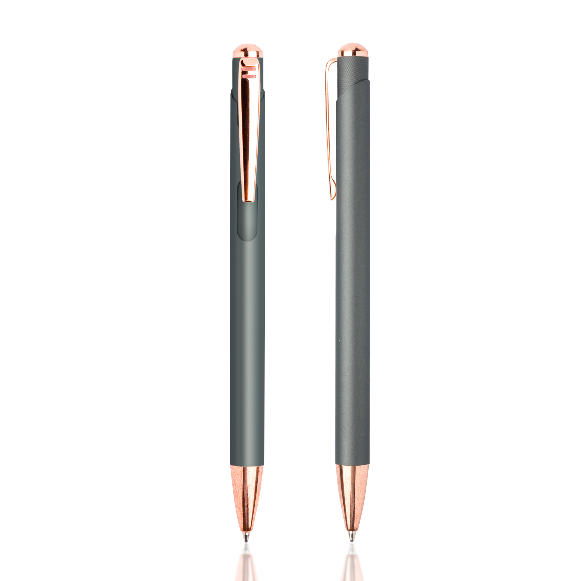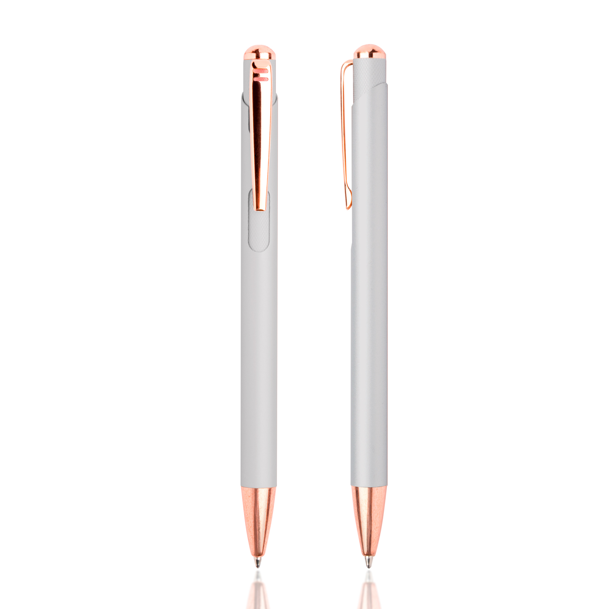 Esferográfica em metal, com detalhes rosa gold. Uma esferográfica feminina, com cores modernas e atrativas. Os detalhes rosa gold atribuem-lhe destaque e elegância. Na gravação a laser, o seu design ficará a combinar com os detalhes. Com sistema pulsar. Esta esferográfica é de escrita azul.
